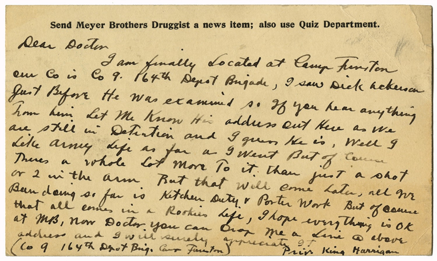 Dear Doctor I am finally located at Camp Funston our Co is Co 9. 164th Depot Brigade, I saw Dickerson just Before He was examined so if you hear anything from him Let Me Know His address out Here as We are still in Detention and I guess He is, Well I Like Army life as far as I went But of course Theres a whole lot more to it than just a shot or 2 in the arm. But that will come later, all we Been doing so far is Kitchen Duty & Porter Work But of Course that all comes in a Rookies life, I hope everything is OK at MB, Now Doctor you can Drop me a line at above (Co 9 164th Depot Brig. Camp Funston) Priv. King Harrigan