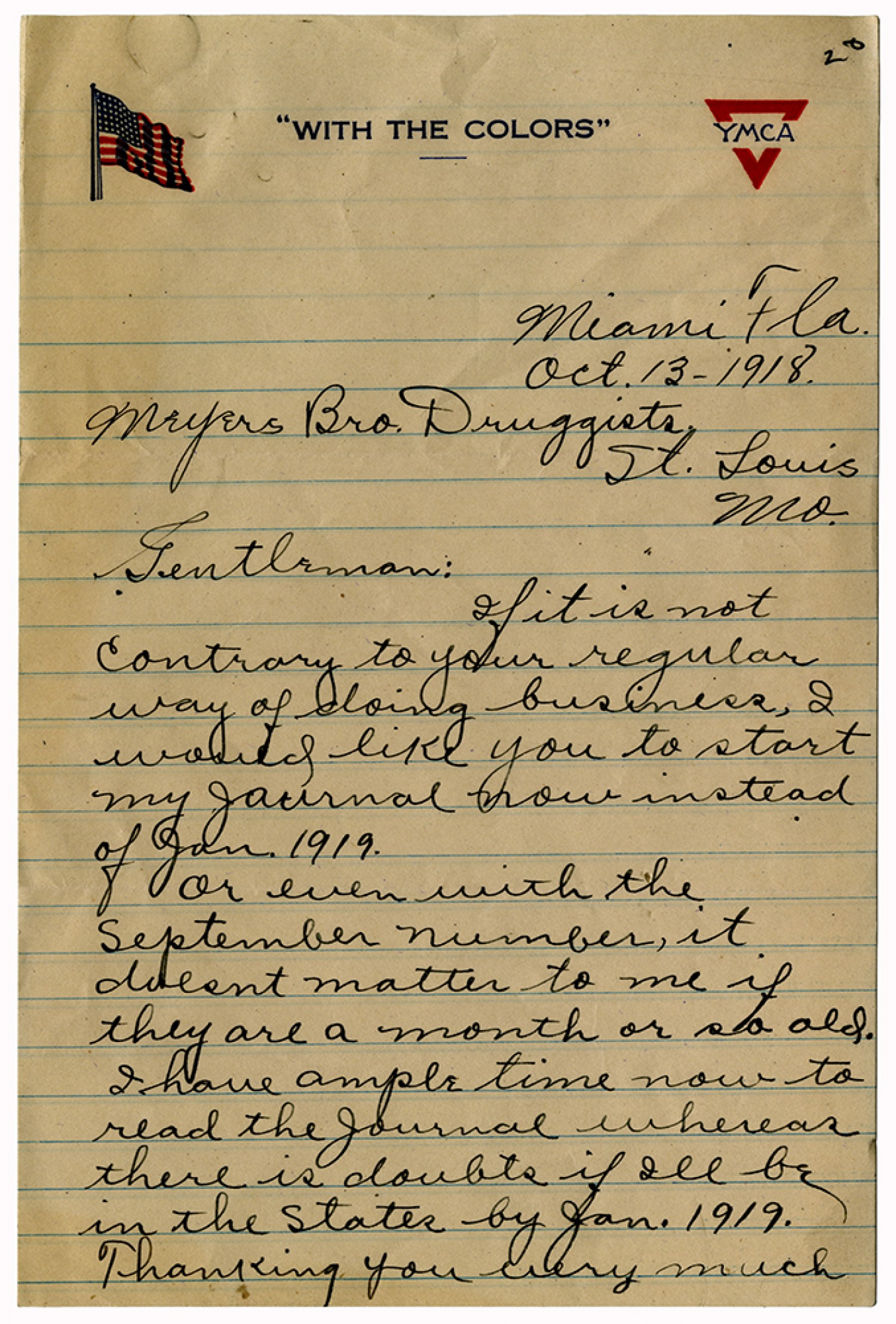 Miami [Florida] [October] 13 – 1918. Meyers [Brothers] Druggists. St. Louis, [Missouri] Gentleman: If it is not Contrary to your regular way of doing business, I would like you to start my journal now instead of [January] 1919. Or even with the September number, it doesnt matter to me if they are a month or so old. I have ample time now to read the journal whereas there is doubts if Ill be in the States by [January ] 1919. Thanking you very much