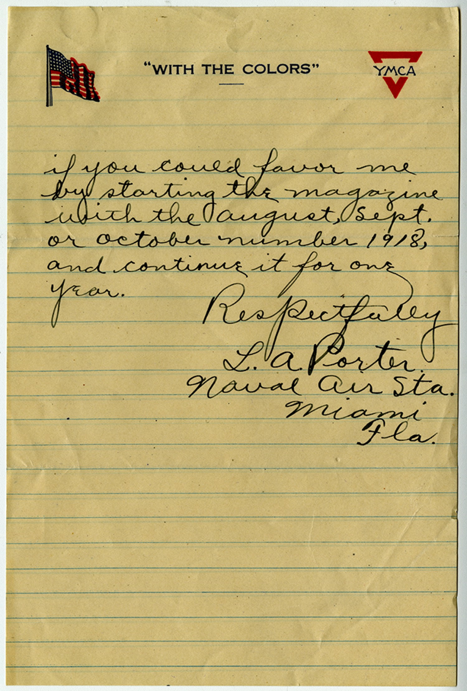 if you could favor me by starting the magazine with the August, [September] or October number 1918, and continue it for one year. Respectfully L. A. Porter Naval Air [Station] Miami [Florida]