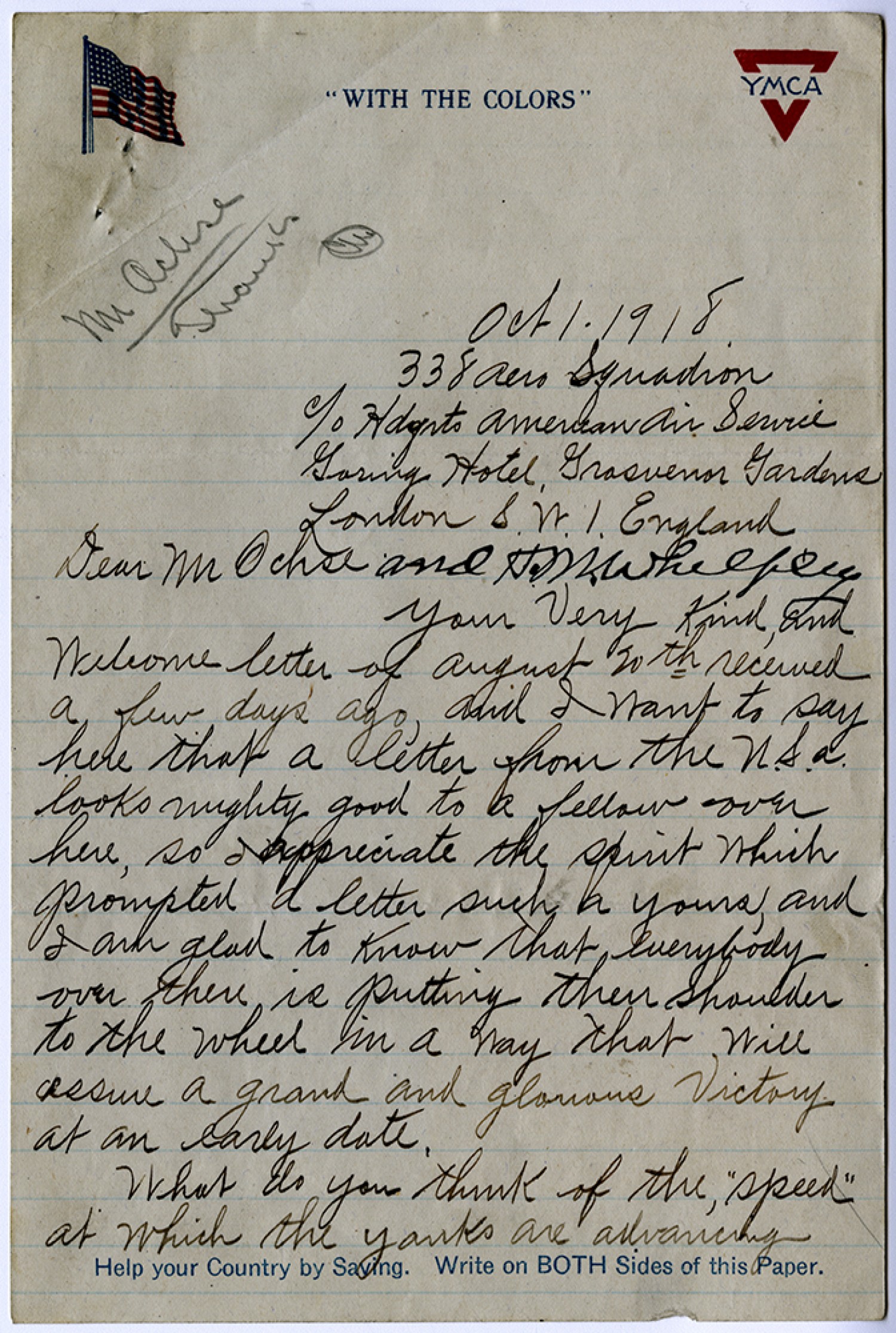 [October] 1, 1918 338 Aero Squadron c/o Hdqrts American Air Service Goring Hotel Grasvenor Gardens London S.W.I. England Dear Mr Ochse and [Henry Milton] Whelpley your very kind, and Welcome letter of August 20th received a few days ago, and I want to say here that a letter from the U.S.A. looks mighty good to a fellow over here, so appreciate the spirit which prompted a letter such a yours, and I am glad to know that everybody over there is putting their shoulder to the wheel in a way that will assure a grand and glamorous Victory at an early date. What do you think of the, “speed” at which the yanks are advancing