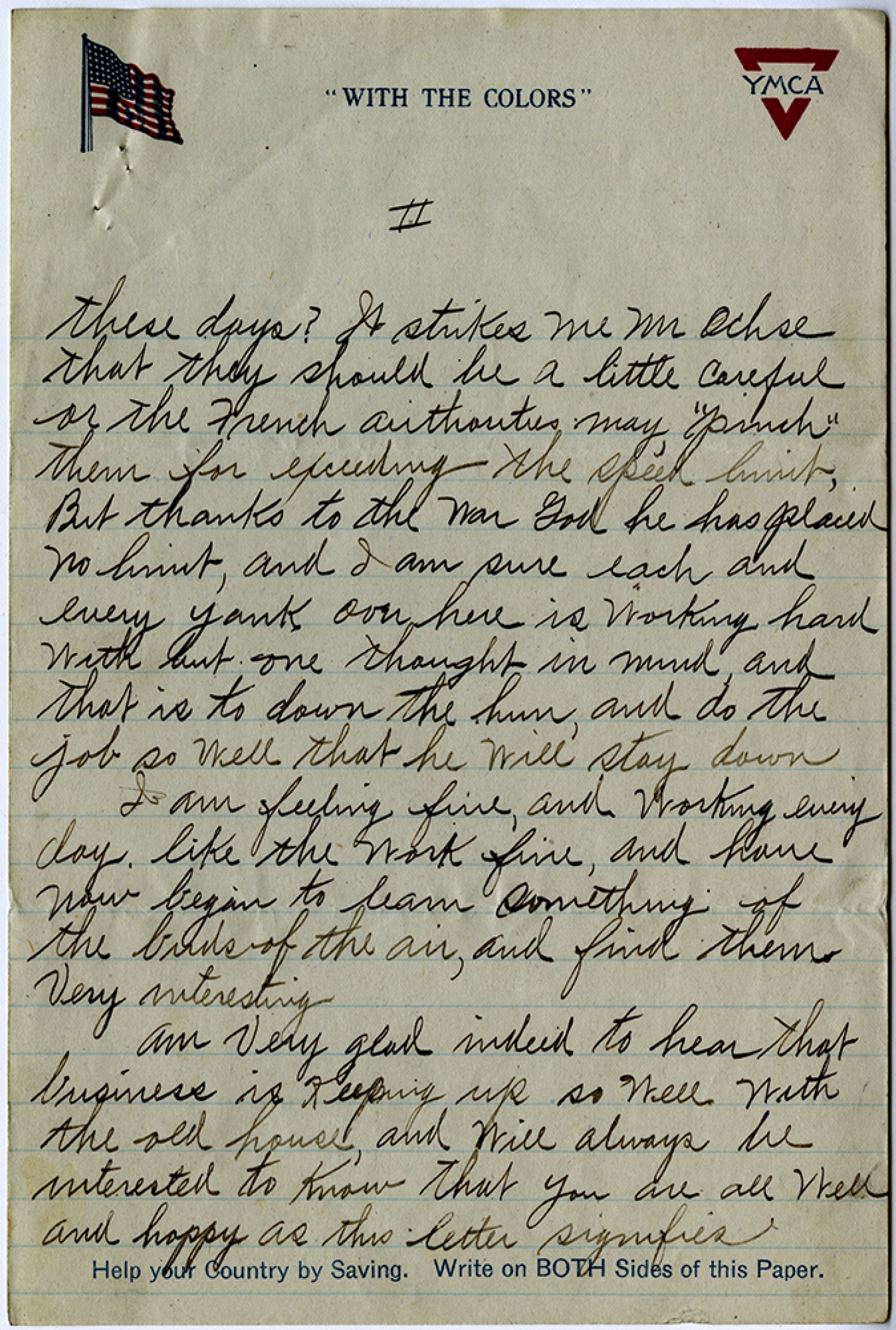 [page 2] these days? It strikes me Mr Ochse that they should be a little careful or the French authorities may “pinch” them for exceeding the speed limit, But thanks to the war God he has placed no limit, and I am sure each and every yank over here is working hard with but one thought in mind, and that is to down the hun, and do the job so well that he will stay down. I am feeling fine, and working every day like the work fine, and have now began to learn something of the birds of the air, and find them very interesting. Am very glad indeed to hear that business is keeping up so well with the old house, and will always be interested to know that you are all well and happy as this letter signifies