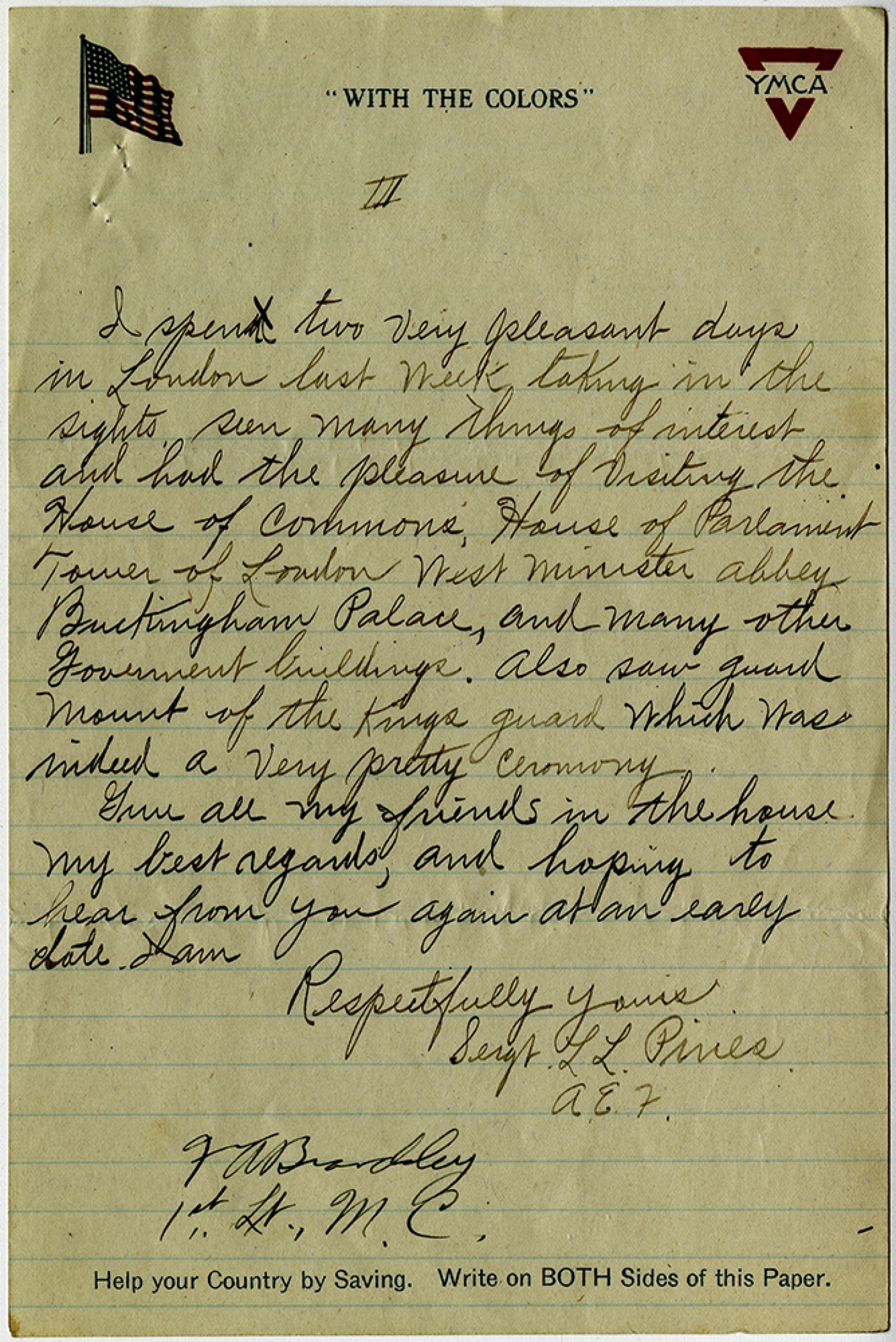 [page 3] I spent two very pleasant days in London last week taking in the sights seen many things of interest and had the pleasure of visiting the House of Commons, House of Parlament Tower of London West Minister Abbey Buckingham Palace, and Many other Government buildings. Also saw guard Mount of the Kings guard which was indeed a very pretty ceremony. Give all my friends in the house my best regards, and hoping to hear from you again at an early date. I am Respectfully yours Sergt. L.L. Piries A.E.F. [censor’s signature]