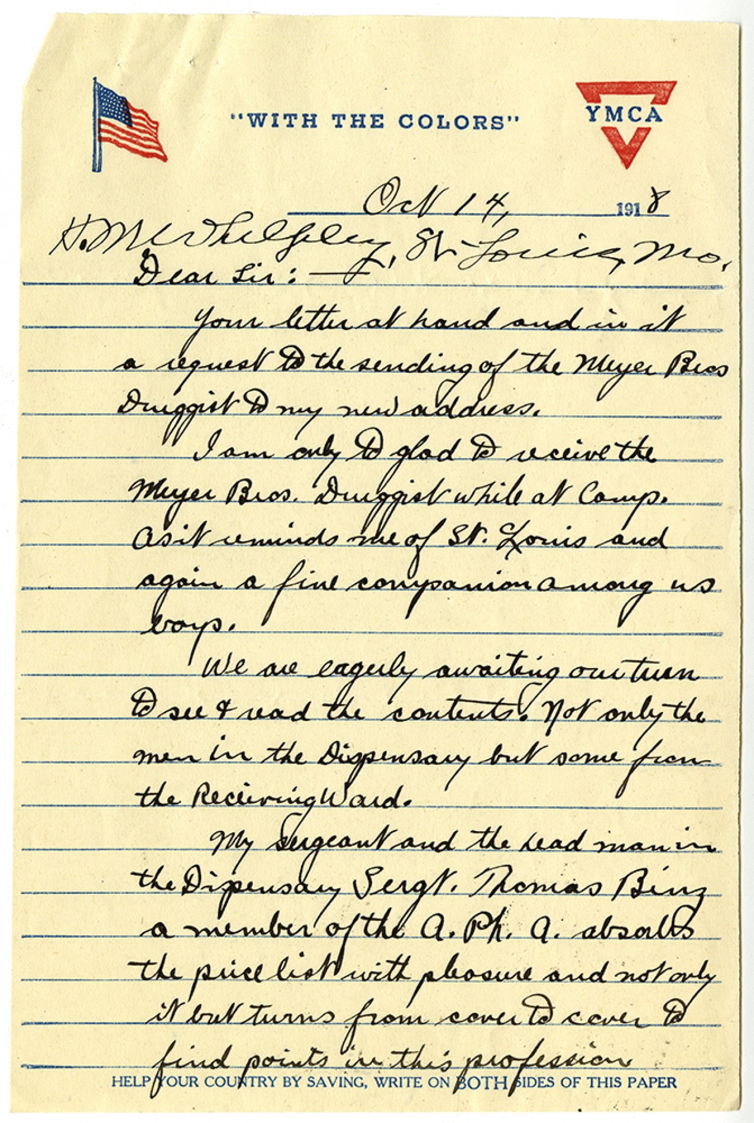 [October] 14, 1918 [Henry Milton] Whelpley St, Louis [Missouri] Dear Sir: - your letter at hand and in it a request to the sending of the Meyer [Brothers] Druggist to my new address. I am only to glad to receive the Meyer [Brothers] Druggist while at camp. As it reminds me of St. Louis and again a fine companion among us boys. We are eagerly awaiting our turn to see & read the contents. Not only the men in the Dispensary but some from the Receiving Ward. My sergeant and the head man in the Dispensary Sergt. Thomas Binz a member of the A. Ph. A. absorbs the price list with pleasure and not only it but turns from cover to cover to find points in this profession