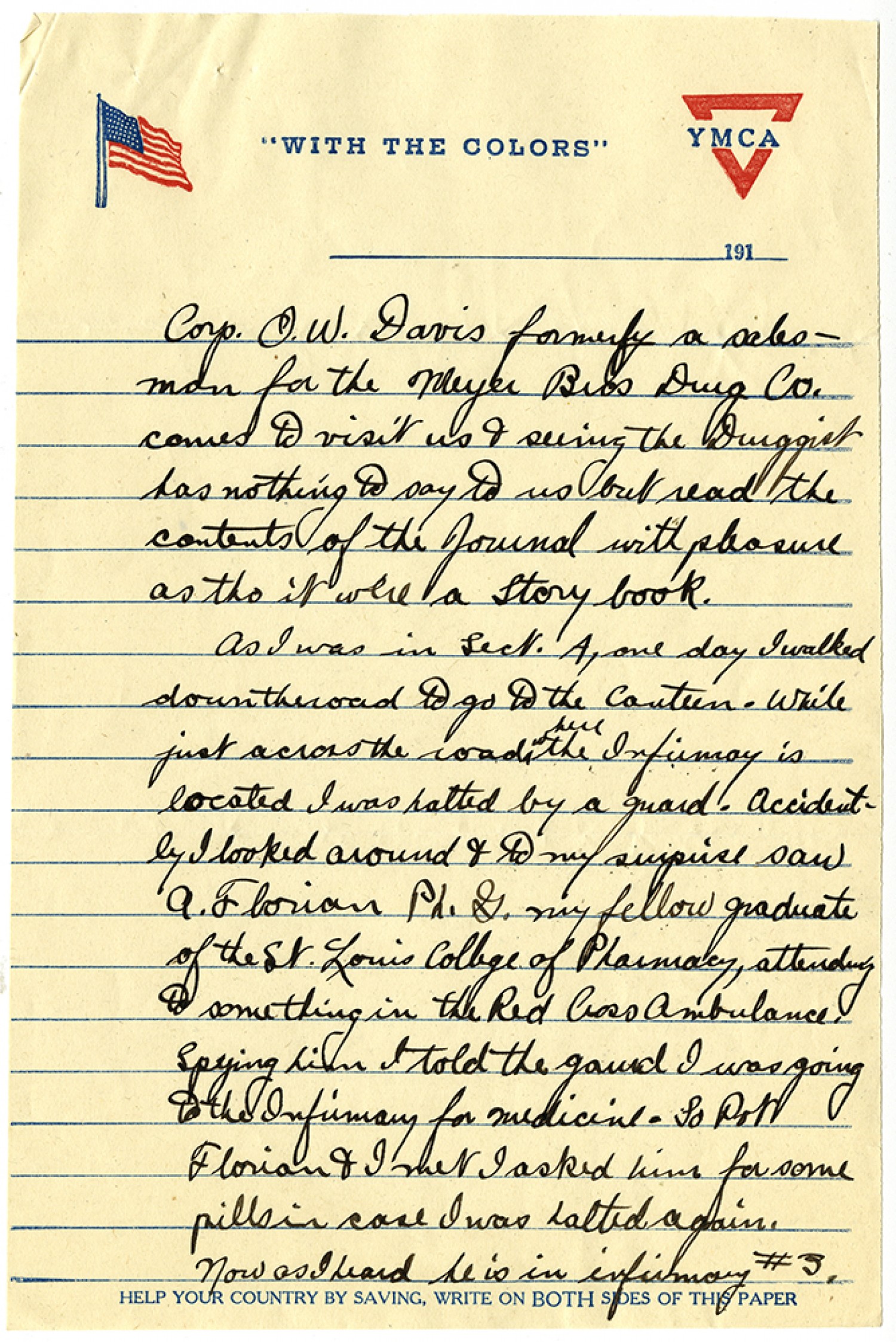Corp J.W. Davis formerly a salesman for the Meyer [Brothers] Drug Co. comes to visit us and seeing the Druggist has nothing to say to us but read the contents of the journal with pleasure as tho it were a story book. As I was in Sect. A, one day I walked down the road to go to the canteen. While just across the road where the Infirmary is located I was halted by a guard. Accidently I looked around & to my surprise saw A. Florian Ph. G. my fellow graduate of the St. Louis College of Pharmacy, attending to something in the Red Cross Ambulance. Spying him I told the gaurd I was going to the Infirmary for Medicine. So Pvt Florian & I met I asked him for some pills in case I was halted again. Now as I heard he is in infirmary #3.