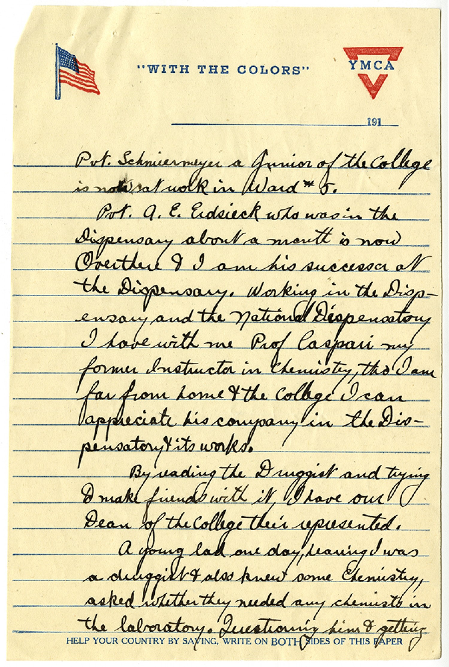 Pvt. Schniermeyer a Junior of the College is now at work in Ward #5. Pvt. A. E. Erdsieck who was in the Dispensary about a month is now Over there & I am his successor at the Dispensatory. Working in the Dispensary and the National Dispensatory I have with me Prof Caspari my former Instructor in Chemistry, tho I am far from home & the College I can appreciate his company in the Dispensatory & its works. By reading the Druggist and trying to make friends with it, I have our Dean of the College their represented. A young lad one day, learning I was a druggist & also knew some chemistry, asked whether they needed any chemists in the laboratory. Questioning him & getting