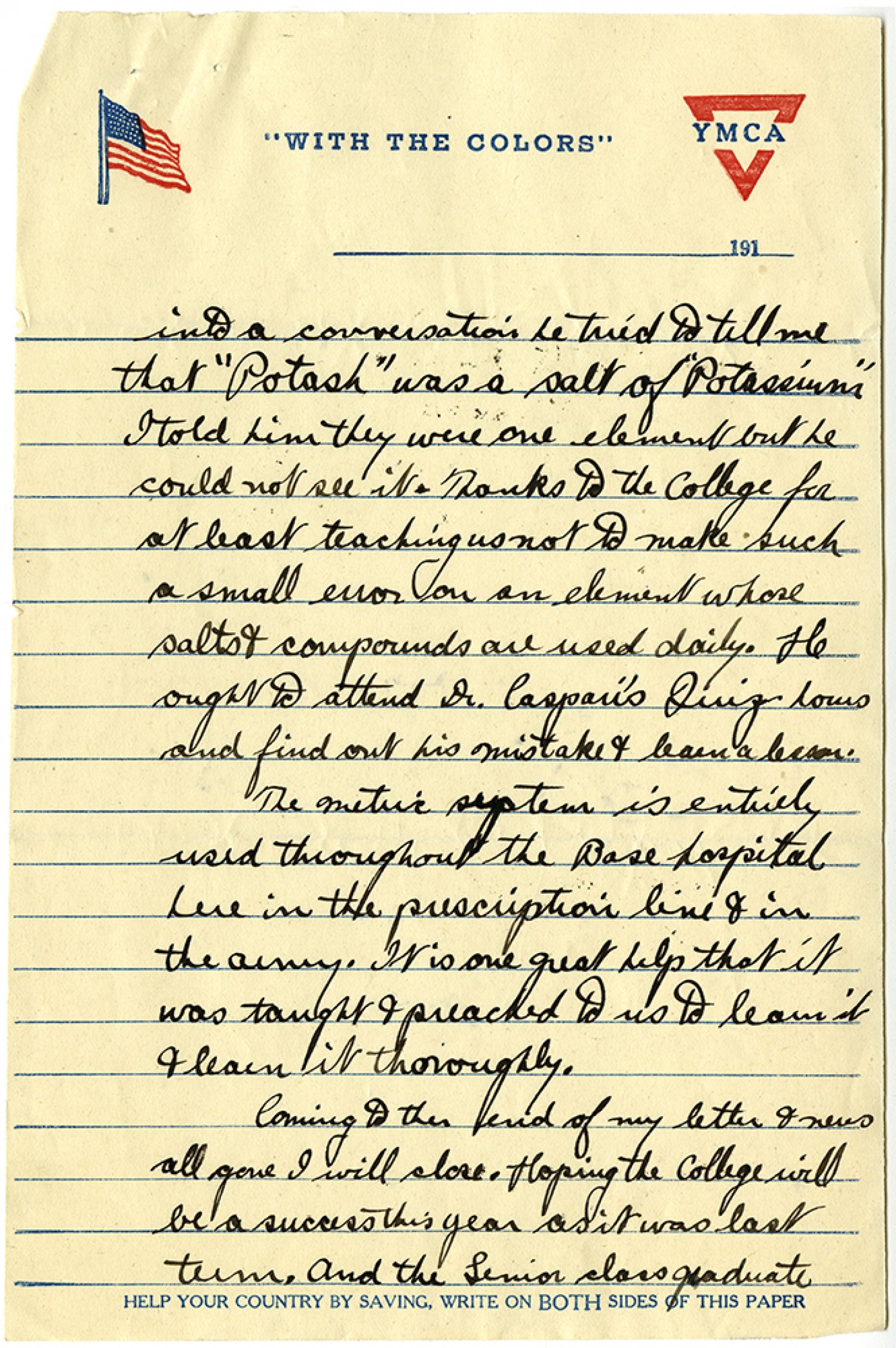 into a conversation he tried to tell me that “Potash” was “a salt of Potassium” I told him they were one element but he could not see it. Thanks to the College for at least teaching us not to make such a small error on an element whose salts & compounds are used daily. He ought to attend Dr. Caspari’s Quiz hours and find out this mistake & learn a lesson. The metric system is entirely used throughout the Base hospital here in the prescription line & in the army. It is one great help that it was taught & preached to us to learn it & learn it thoroughly. Coming to the end of my letter and news all gone I will close. Hoping the college will be a success this year as it was last term. And the Senior class graduate