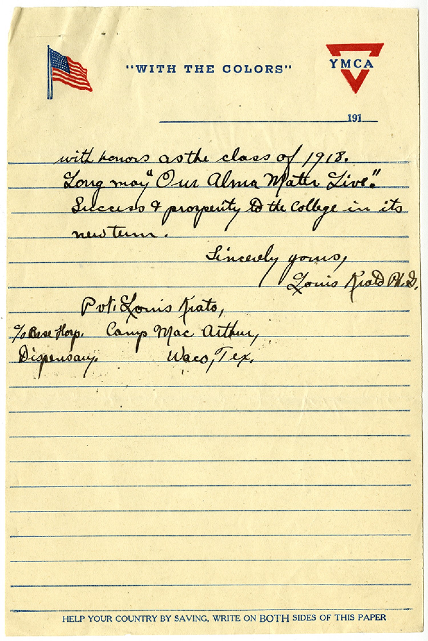 with honors as the class of 1918. Long may “Our Alma Mater Live.” Success & prosperity to the college in its new term. Sincerely yours, Louis Krato Ph.G. Pvt. Louis Krato, c/o Base Hosp. Dispensary Camp MacArthur, Waco, [Texas]