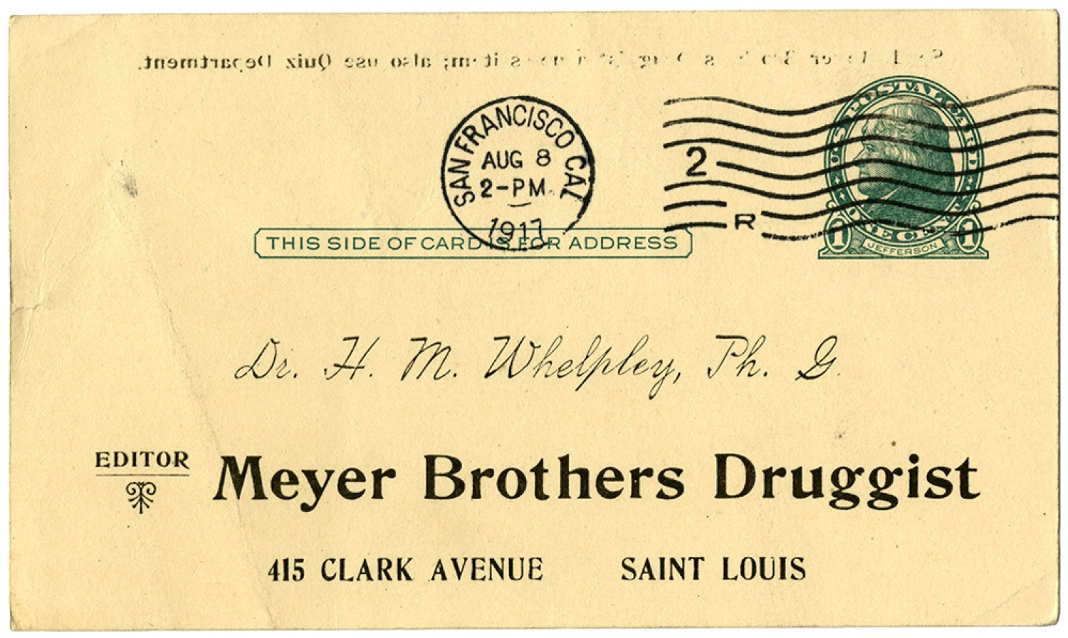 | Source | Chiles, Philip L. Postcard to Dr. Henry Milton Whelpley. 8 August 1917. Dr. Henry Milton Whelpley Collection, 1826-1929. A1737. Missouri History Museum, St. Louis, Missouri. |
