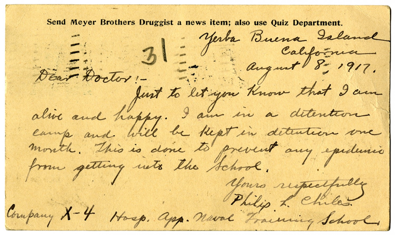 Yerba Buena Island California August 8, 1917. Dear Doctor: – Just to let you know that I am alive and happy. I am in a detention camp and will be kept in detention one month. This is done to prevent any epidemic from getting into the School. Yours respectfully Philip L. Chiles. Company X-4 [Hospital] App. Naval Training School.