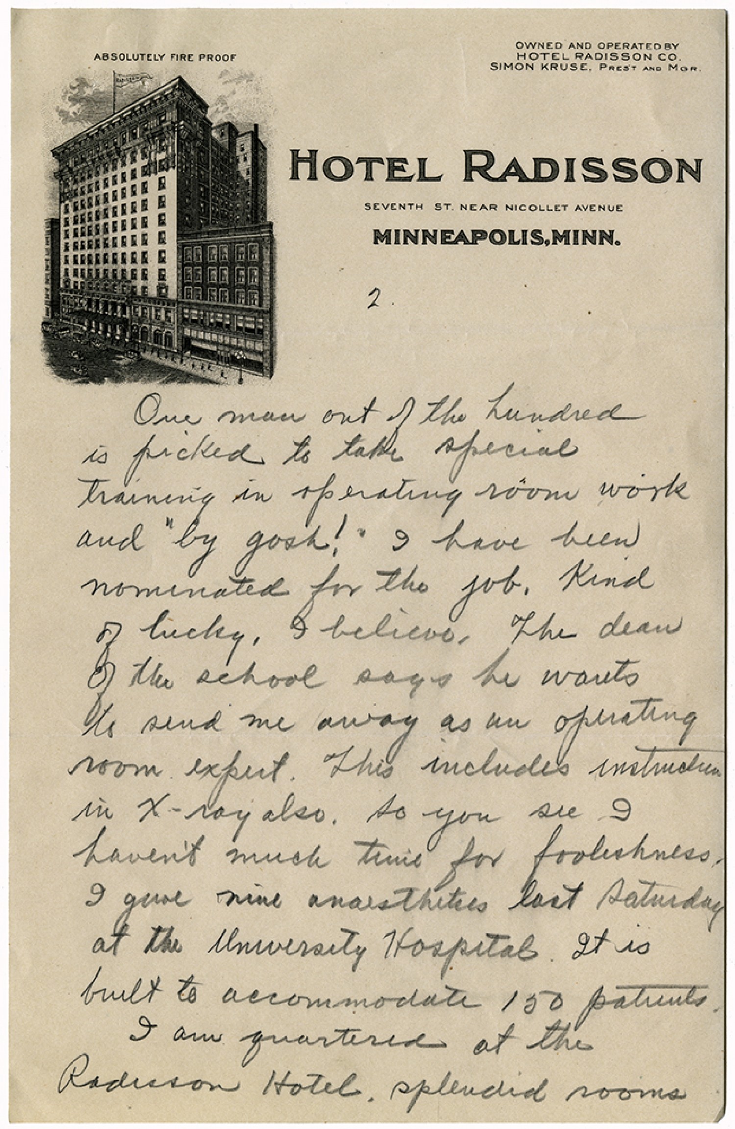 [page 2] One man out of the hundred is picked to take special training in operating room work and “by gosh!” I have been nominated for the job. Kind of lucky, I believe. The dean of the school says he wants to send me away as an operating room expert. This includes instruction in X-ray also. So you see I haven’t much time for foolishness. I give mine anaesthetics last Saturday at the University Hospital. It is built to accommodate 150 patients. I am quartered at the Radisson Hotel splendid rooms