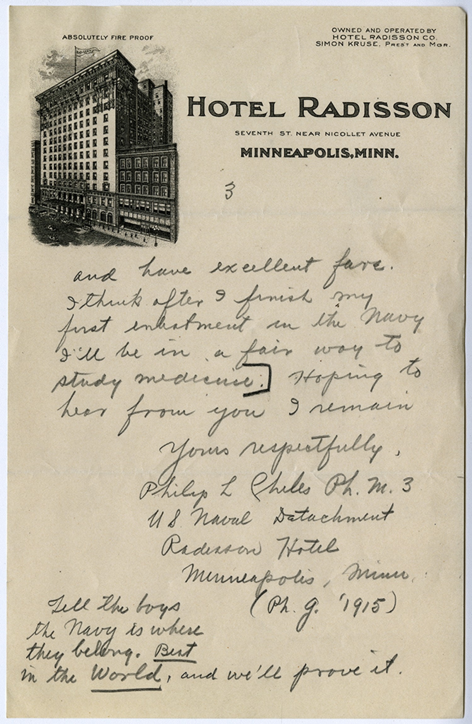 [page 3] and have excellent fare. I think after I finish my first enlistment in the Navy I’ll be in a fair way to study medicine.) Hoping to hear from you I remain Yours respectfully, Philip L Chiles Ph. M. 3 US Naval Detachment Radisson Hotel Minneapolis, [Minnesota] (Ph.g. ‘1915) Tell the boys the Navy is where they belong. Best in the World, and we’ll prove it.