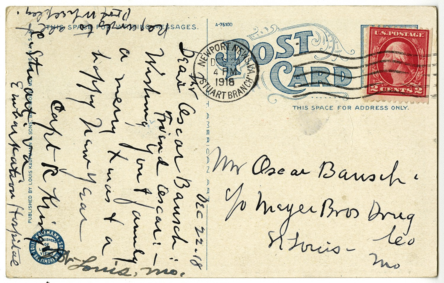 Mr. Oscar Bausch c/o Meyer [Brothers] Drug Co St. Louis, [Missouri] [written vertically] [December] 22 - [1918] Dear Oscar Bausch: Friend Oscar: - Wishing you & family a merry Xmas & a happy New Year Capt R. King of St. Louis [Missouri] [Camp] Stuart, [Virginia] Embarkation Hospital [written in margin] Regards to all & Prof. Whelpley.