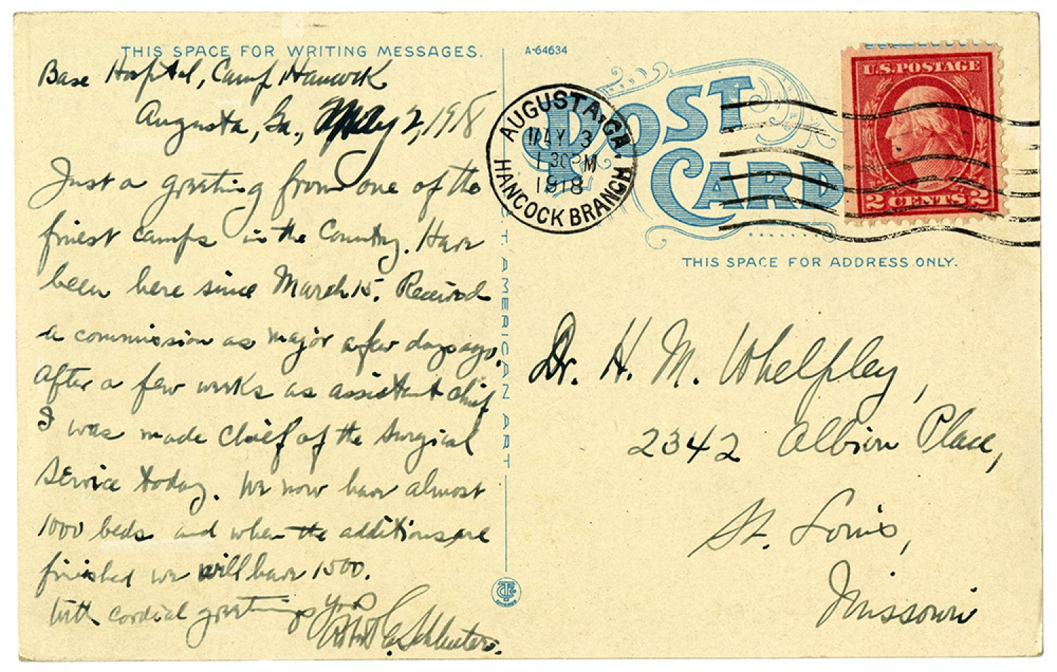 Base Hospital, Camp Hancock Augusta, [Georgia] May 2, 1918 Just a greeting from one of the finest camps in the country. Have been here since March 15. Received a commission as major a few days ago. After a few works as assistant chief I was made chief of the surgical service today. We now have almost 1000 beds and when the additions are finished we will have 1500. With cordial greetings yours Robert E Schluster Dr. [Henry Milton] Whelpley 2342 Albion Place, St. Louis, Missouri