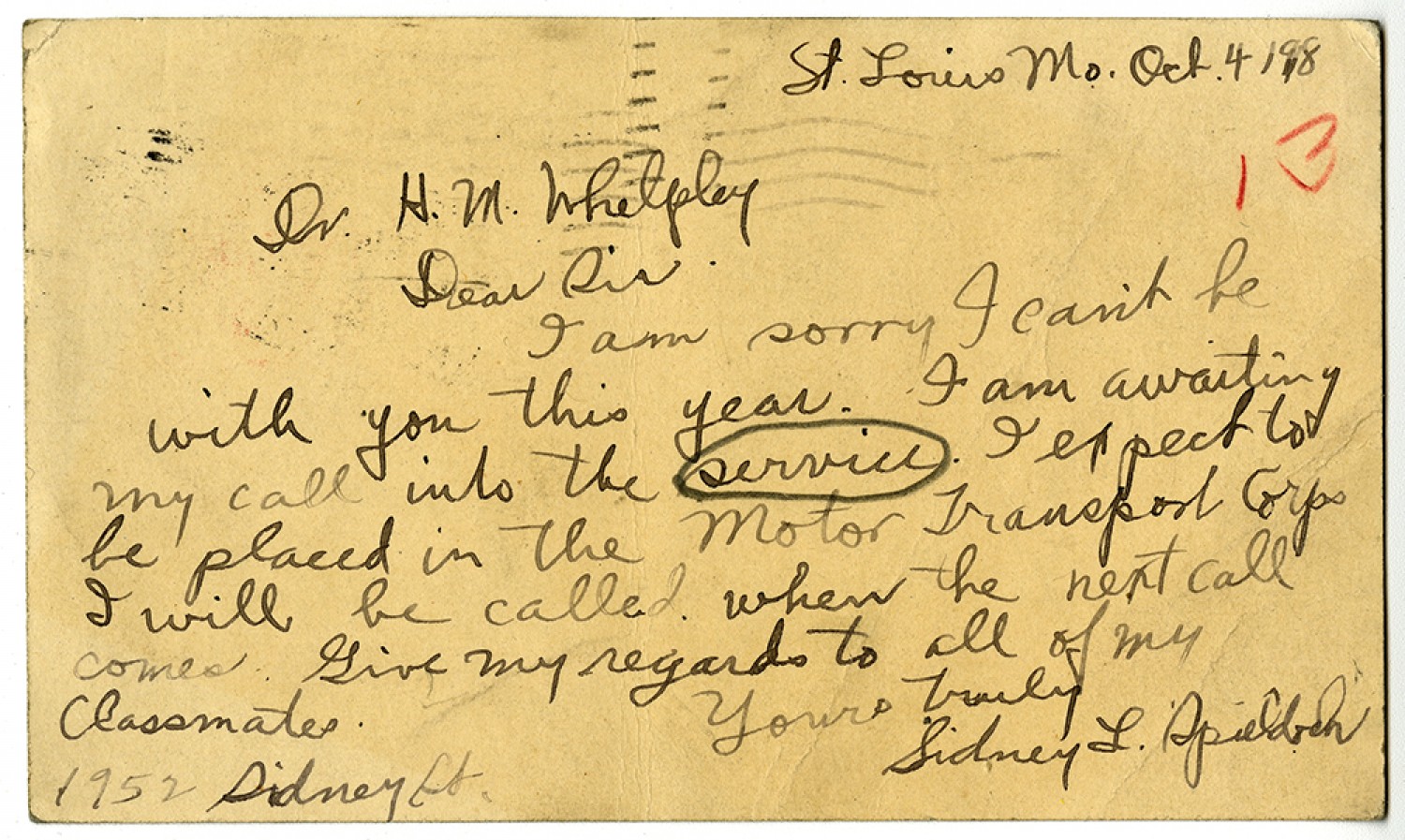 St. Louis [Missouri] [October] 4, 1918 Dr. [Henry Milton] Whelpley Dear Sir I am sorry I can’t be with you this year. I am awaiting my call into the service. I expect to be placed in the Motor Transport Corps I will be called when the next call comes. Give my regards to all of my classmates. Yours Truly Sidney L. Spieldren 1952 Sidney St.