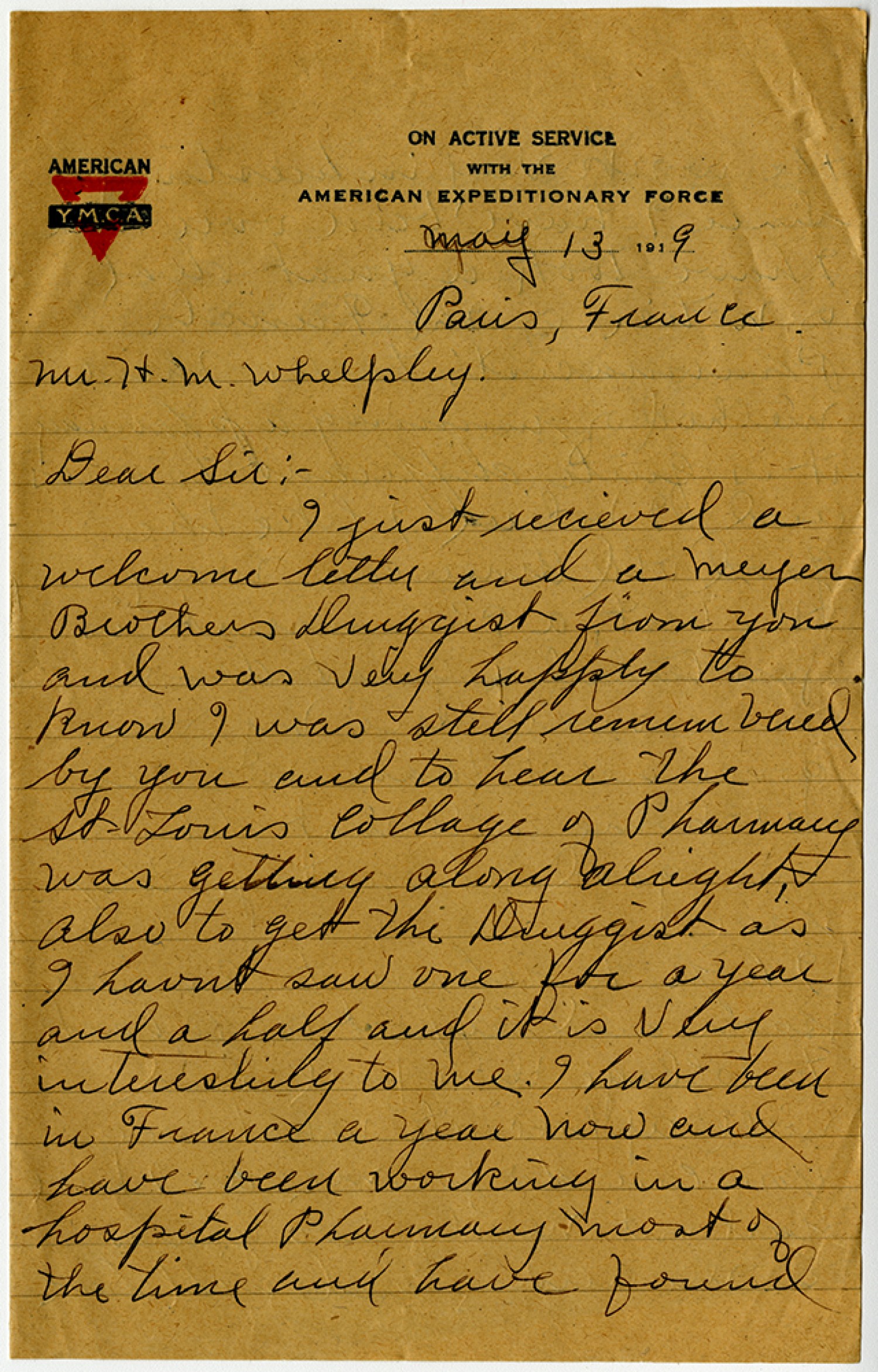 May 13, [1919] Paris, France Mr. [Henry Milton] Whelpley Dear Sir:- I just recieved a welcome letter and a Meyer Brothers Druggist from you and was very happly to know I was still remembered by you and to hear the St. Louis [College] of Pharmacy was getting along alright, also to get the Druggist as I havnt saw one for a year and a half and it is very interesting to me. I have been in France a year now and have been working in a hospital Pharmacy most of the time and have found