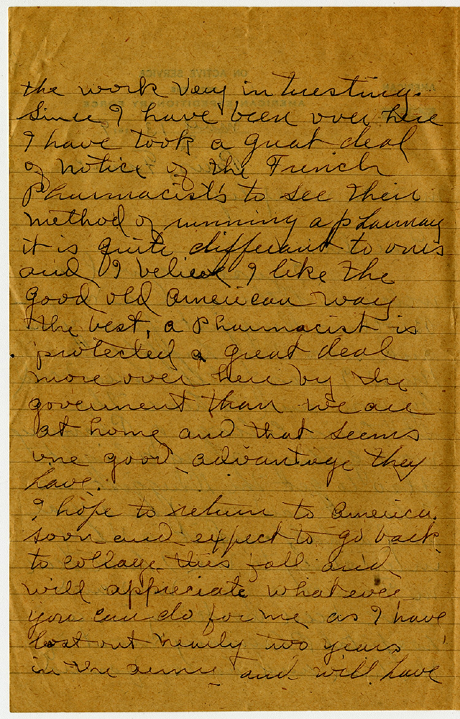 the work very interesting. Since I have been over here I have took a great deal of notice of the French Pharmacist’s to See their method of running a pharmacy it is quite different to ours and I believe I like the good old American way the best, a Pharmacist is protected a great deal more over here by the government than we are at home and that seems one good advantage they have. I hope to return to America soon and expect to go back to collage this fall and will appreciate whatever you can do for me as I have lost out nearly two years in the army and will have