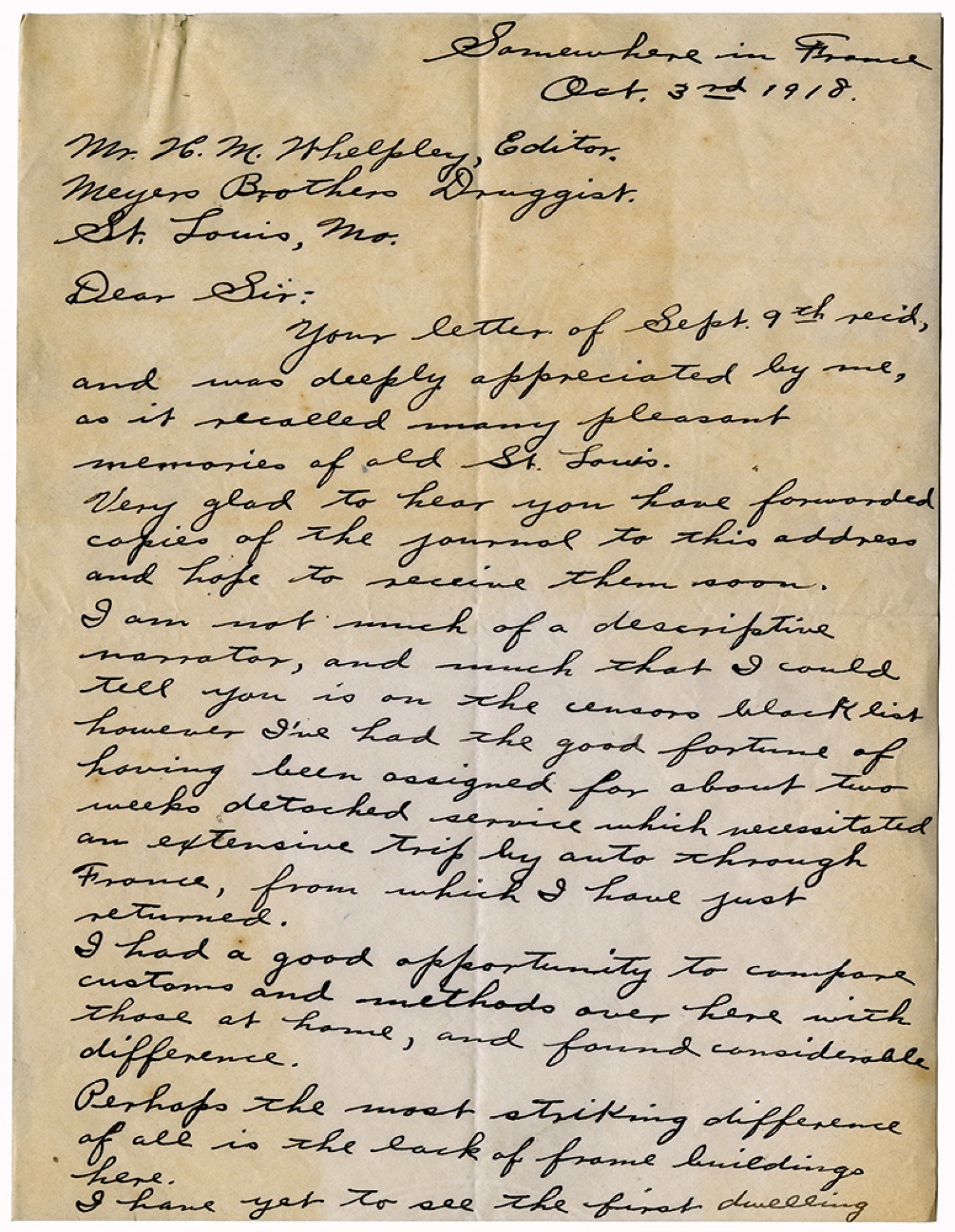 Somewhere in France [October] 3rd 1918. Mr. [Henry Milton] Whelpley, Editor. Meyers Brothers Druggist. St. Louis, [Missouri] Dear Sir: Your letter of [September] 9th rec’d, and was deeply appreciated by me, as it recalled many pleasant memories of old St. Louis. Very glad to hear you have forwarded copies of the journal to this address and hope to receive them soon. I am not much of a descriptive narrator, and much that I could tell you is on the censors black list however I’ve had the good fortune of having been assigned for about two weeks detached service which necessitated an extensive trip by auto through France, from which I have just returned. I had a good opportunity to compare customs and methods over here with those at home, and found considerable difference. Perhaps the most striking difference of all is the lack of frame buildings here. I have yet to see the first dwelling