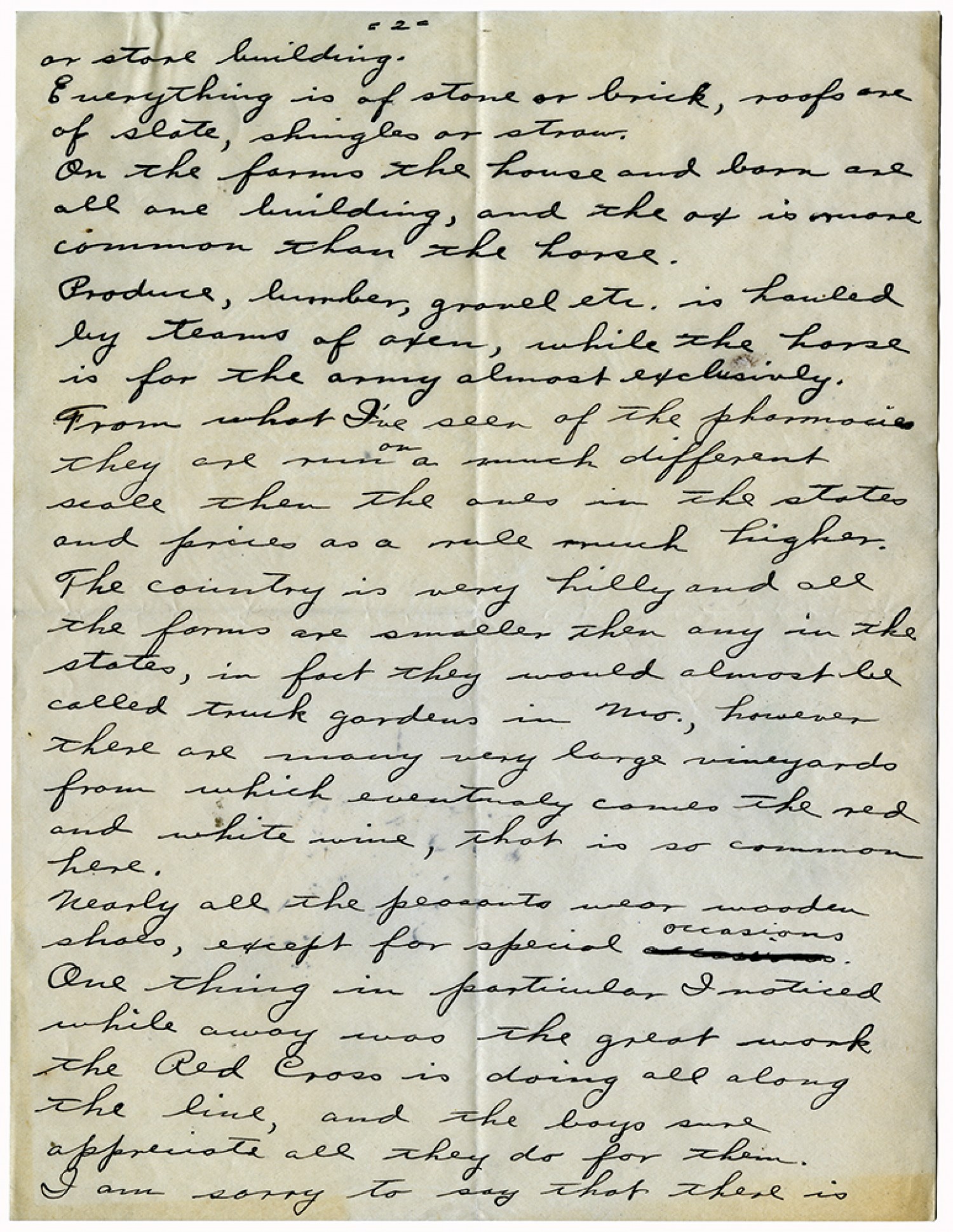 [page 2] or stone building. Everything is of stone or brick, roofs are of slate, shingles or straw. On the farms the house and barn are all one building, and the ox is more common than the horse. Produce, lumber, gravel etc. is hauled by teams of oxen, while the horse is for the army almost exclusively. From what I’ve seen of the pharmacies they are run on a much different scale than the ones in the states and prices as a rule much higher. The country is very hilly and all the farms are smaller then any in the states, in fact they would almost be called truck gardens in [Missouri], however there are many very large vineyards from which eventualy comes the red and white wine, that is so common here. Nearly all the peasants wear wooden shoes, except for special occasions. One thing in particular I noticed while away was the great work the Red Cross is doing all along the line, and the boys sure appreciate all they do for them. I am sorry to say that there is