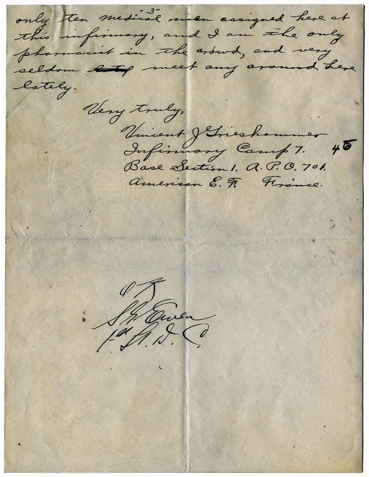 [page 3] only ten Medical men assigned here at this infirmary, and I am the only pharmacist in the crowd, and very seldom meet any around here lately. Very truly, Vincent J Grieshammer Infirmary Camp 7. Base Section 1. A.P.O. 701. American [Expeditionary Force] France [censor’s signature]