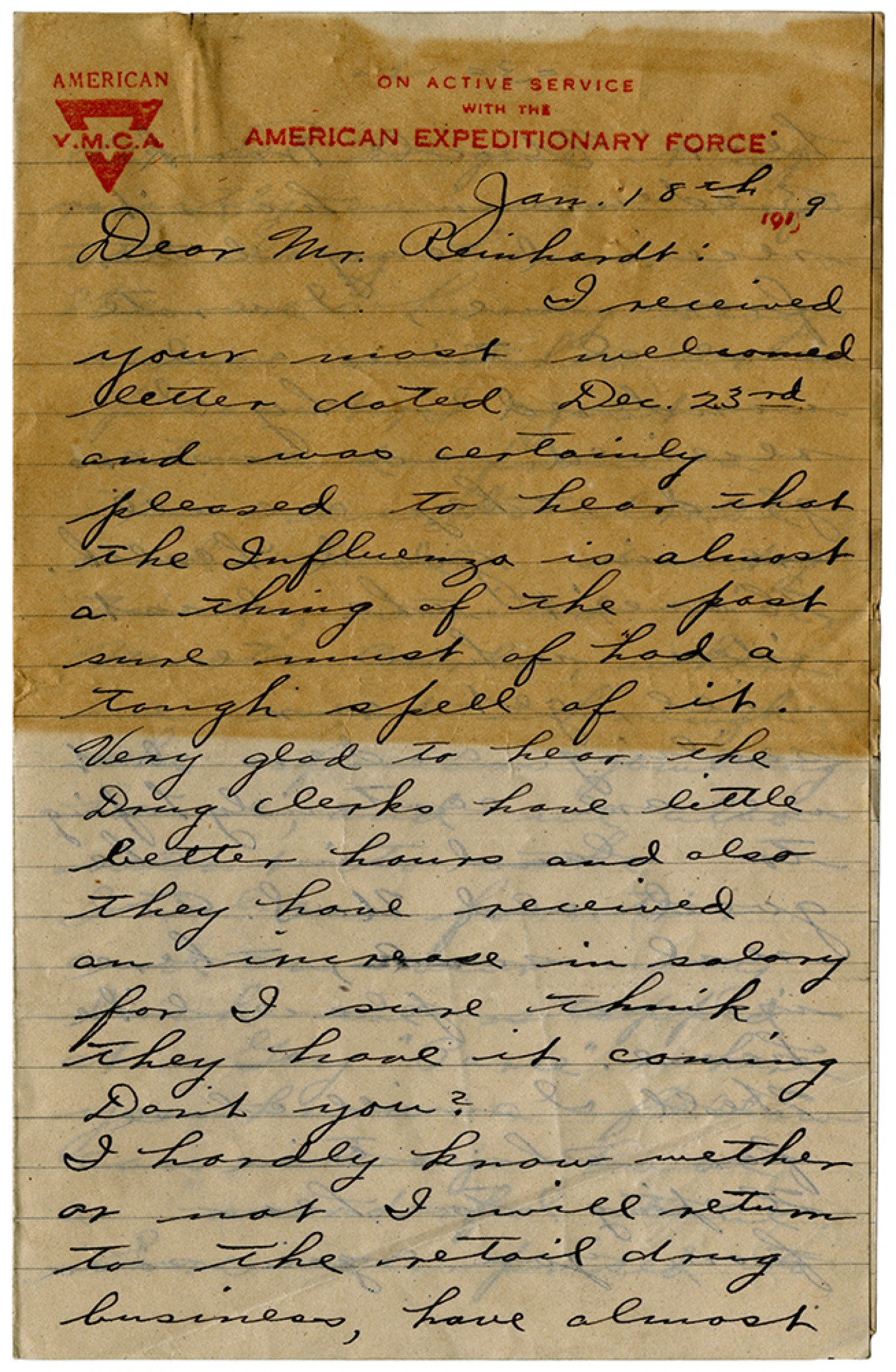 [January] 18th [1919] Dear Mr. Reinhardt: I received your most Welcomed letter dated [December] 23rd and was certainly pleased to hear that the Influenza is almost a thing of the past sure must of had a tough spell of it. Very glad to hear that Drug clerks have little better hours and also they have received an increase in salary for I sure think they have it coming Don’t you? I hardly know wether or not I will return to the retail drug business, have almost