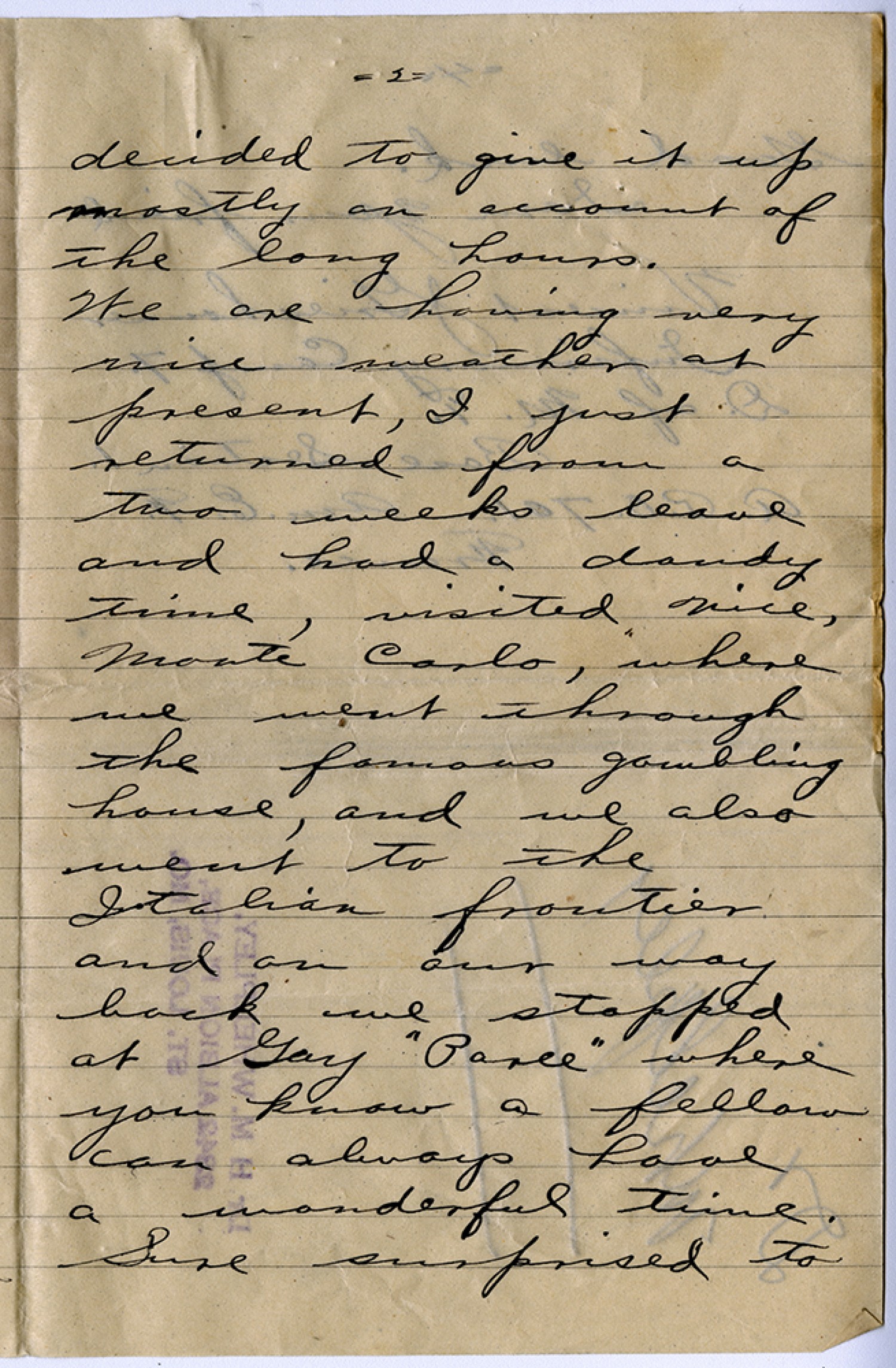 [page 2] decided to give it up mostly on account of the long hours. We are having very nice weather at present, I just returned from a two weeks leave and had a dandy time, visited Nice, Monte Carlo, where we went through the famous gambling house, and we also went to the Italian frontier and on our way back we stopped at Gay “Paree” where you know a fellow can always have a wonderful time. Sure surpised to