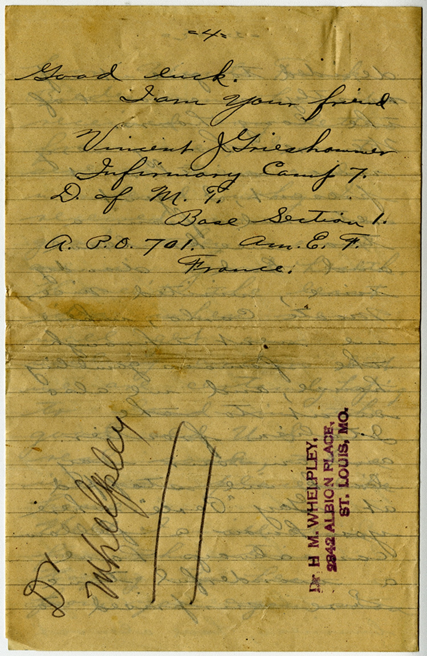[page 4] Good luck, I am your friend Vincent Grieshammer Infirmary Camp 7. D. of M.T. Base Section 1. A.P.O. 701. [American Expeditionary Forces] France [written vertically] Dr Whelpley Dr [Henry Milton] WHELPLEY, 2342 ALBION PLACE, ST. LOUIS, [Missouri]