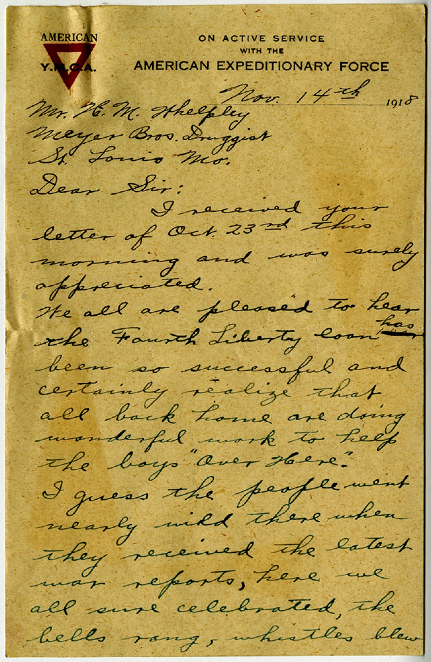 [November] 14th 1918. Mr. [Henry Milton] Whelpley Meyer [Brothers] Druggist St. Louis [Missouri] Dear Sir: I received your letter of [October] 23rd this morning and was surely appreciated. We all are pleased to hear the Fourth Liberty loan has been so successful and certainly realize that all back home are doing wonderful work to help the boys “Over Here.” I guess the people went nearly wild there when they received the latest war reports, here we all sure celebrated, the bells rang, whistles blew