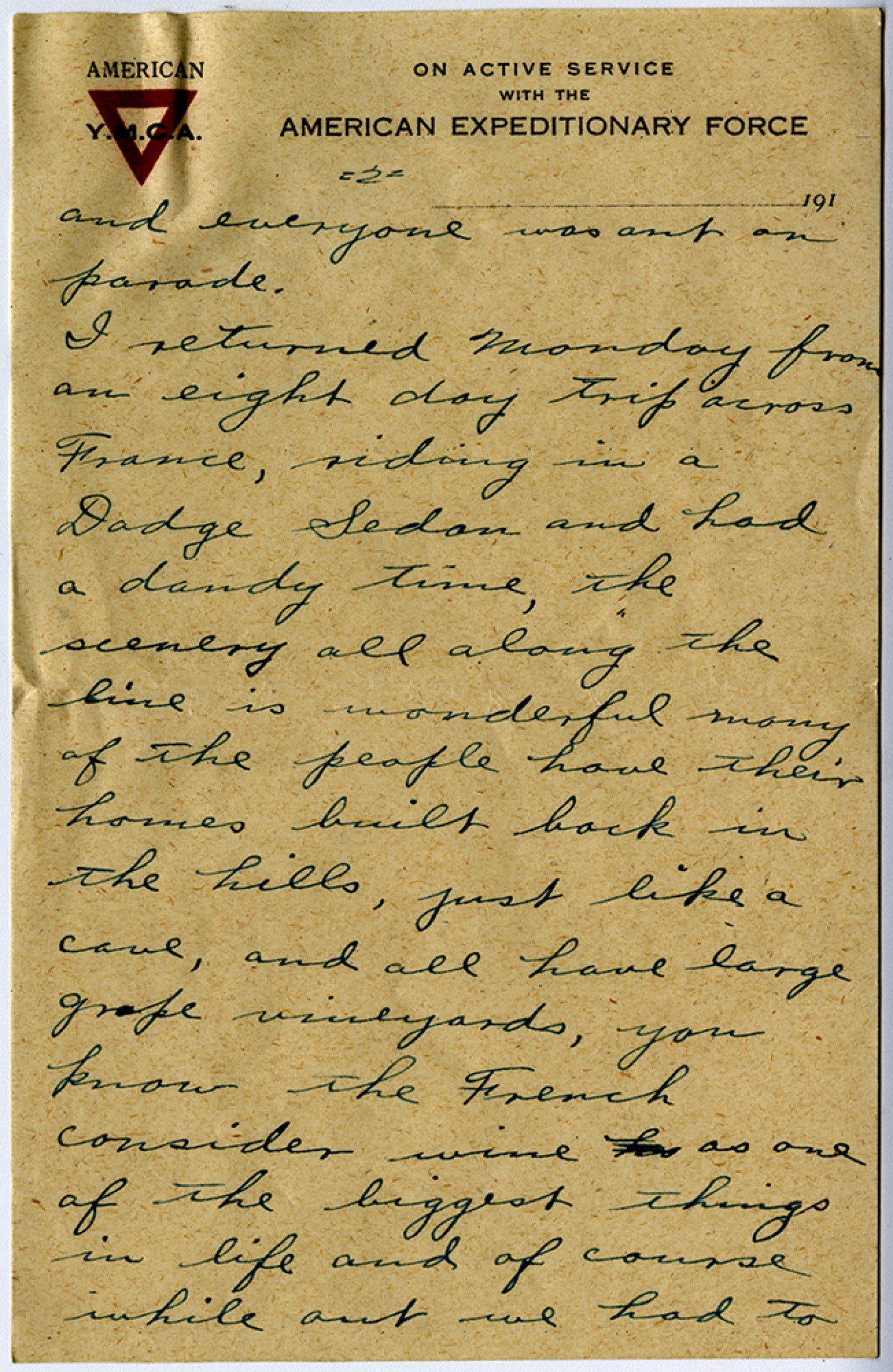 [page 2] and everyone was out on parade. I returned Monday from an eight day trip across France, riding in a Dodge Sedan and had a dandy time, the scenery all along the line is wonderful many of the people have their homes built back in the hills, just like a cave, and all have large grape vineyards, you know the French consider wine as one of the biggest things in life and of course while out we had to