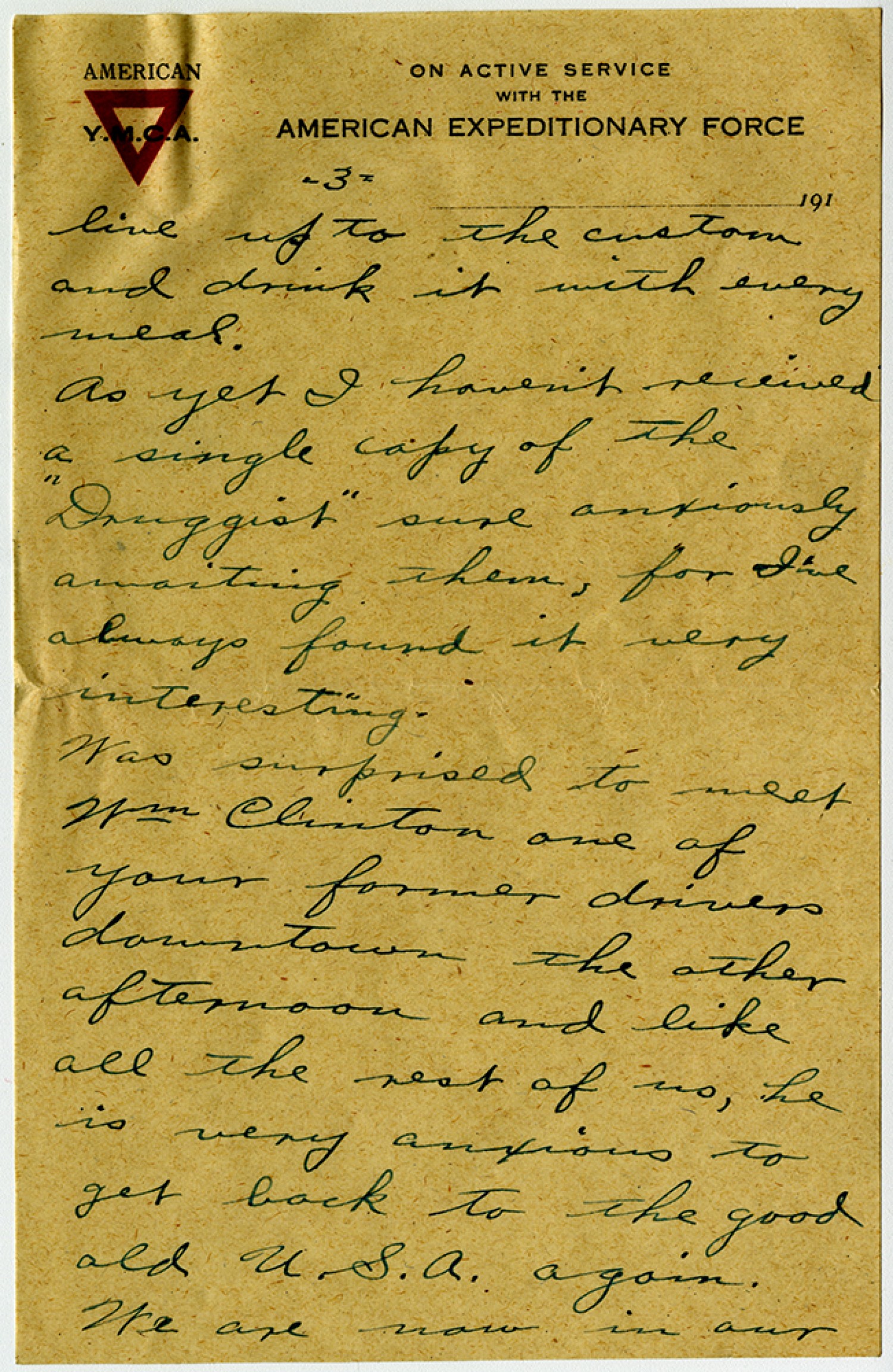 [page 3] live up to the custom and drink it with every meal. As yet I haven’t received a single copy of the “Druggist” sure anxiously awaiting them, for I’ve always found it very interesting. Was surprised to meet William Clinton one of your former drivers downtown the other afternoon and like all the rest of us, he is very anxious to get back to the good old U.S.A. again. We are now in our