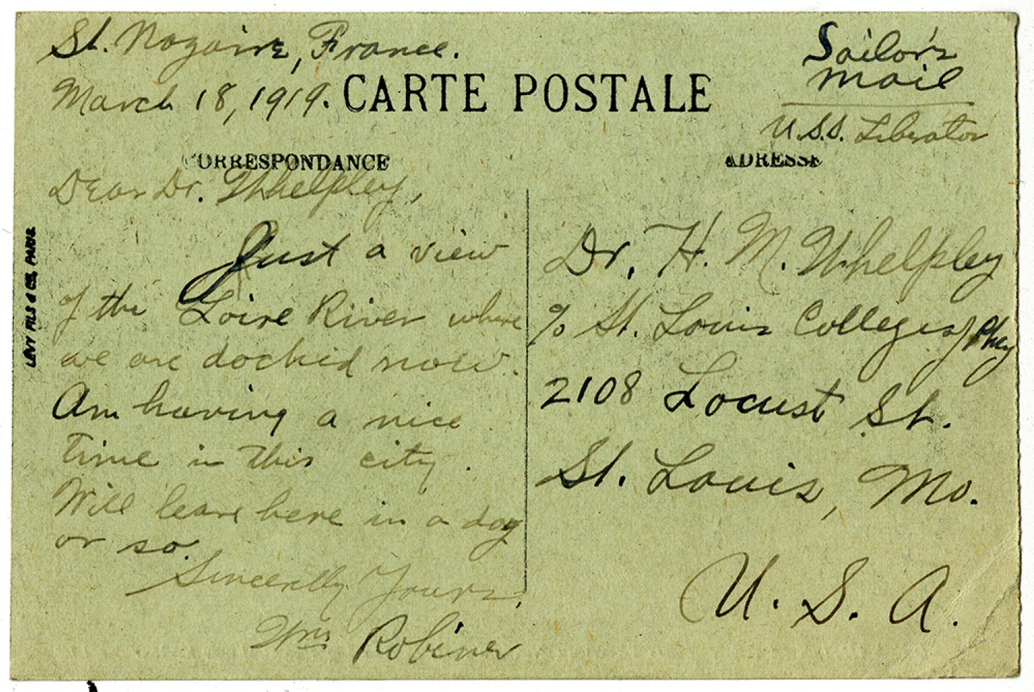 [SAINT-NAZAIRE], France March 18, 1919. Sailor’s mail U.S.S. Liberator Dear Dr. Whelpley Just a view of the Loine River where we are docked now. Am having a nice time in this city. Will leave here in a day or so. Sincerely yours [William] Robiner Dr. [Henry Milton] Whelpley c/o [St. Louis College of Pharmacy] 2108 Locust Street. St. Louis, [Missouri] U.S.A.