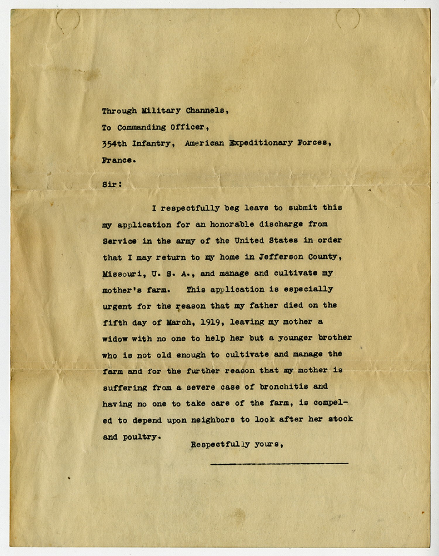 Through Military Channels, To Commanding Officer, 354th Infantry, American Expeditionary Forces, France Sir: I respectfully beg leave to submit this my application for an honorable discharge from Service in the army of the United States in order that I may return to my home if Jefferson County, Missouri, U.S.A., and manage and cultivate my mother