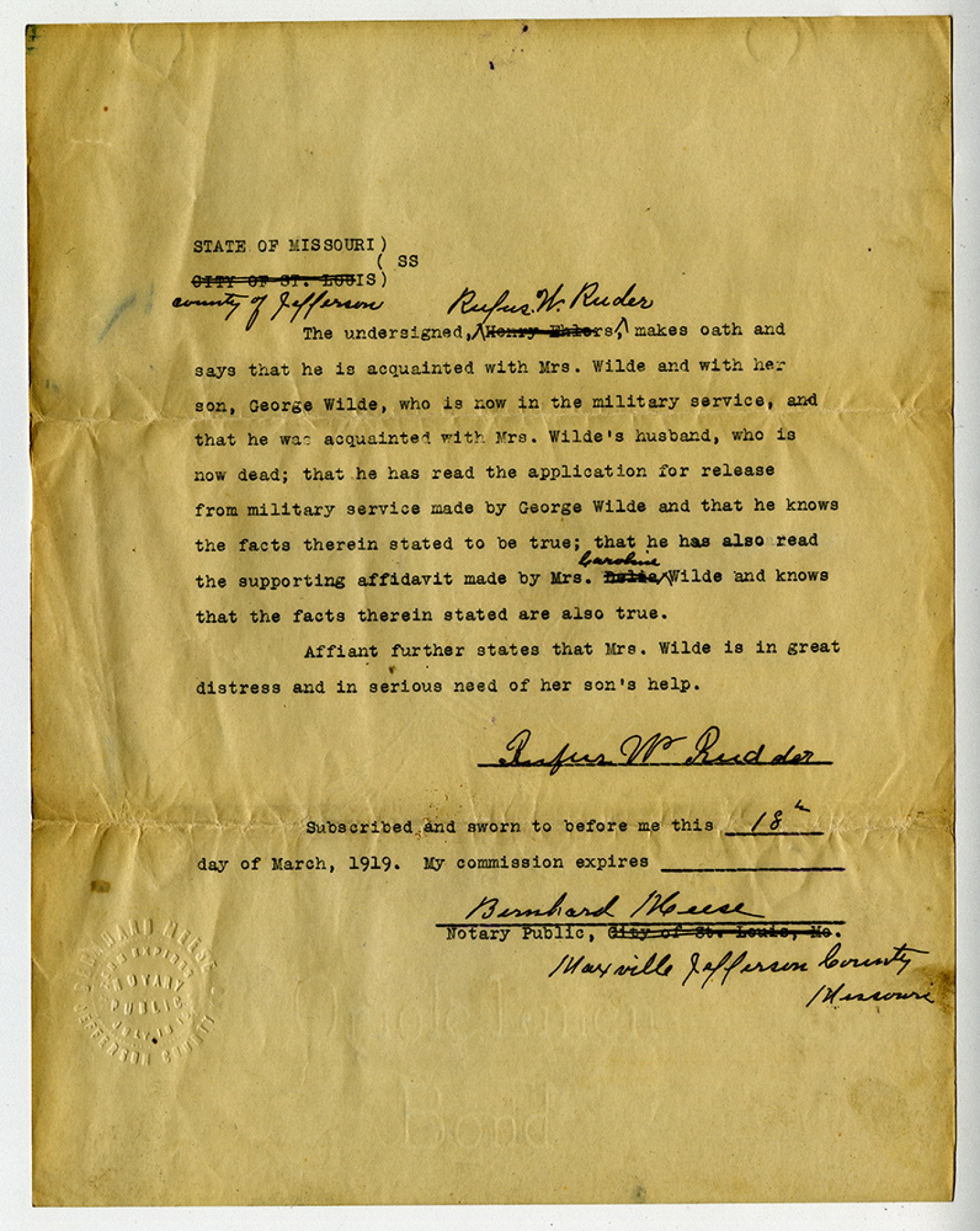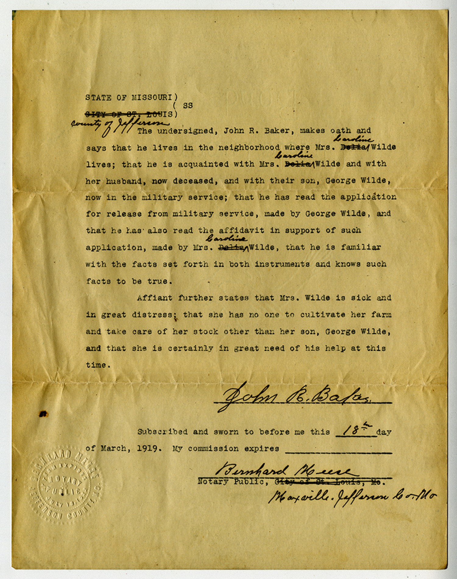 State of Missouri County of Jefferson SS the undersigned, John R. Baker, makes oath and says that he lives in the neighborhood where Mrs. Caroline Wilde lives; that he is acquainted with Mrs. Caroline Wilde and with her husband, now deceased, and with their son, George Wilde, now in the military service; that he has read the application for release from military service, made by George Wilde, and that he has also read the affidavit in support of such application, made by Mrs. Caroline Wilde, that he is familiar with the facts set forth in both instruments and knows such facts to be true. Affiant further states that Mrs. Wilde is sick and in great distress; that she has no one to cultivate her farm and take care of her stock other than her son, George Wilde, and that she is certainly in great need of his help at this time. John R. Baker Subscribed and sworn to before me the 18th day of March, 1919. My commission expires Bernhard Meese Notary Public, Maxville, Jefferson Co [Missouri]