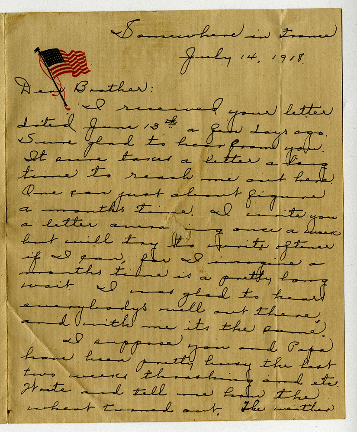Somewhere in France July 14, 1918. Dear Brother; I received your letter dated June 13th a few days ago. Sure glad to hear from you. It sure takes a letter a long time to reach me out here. One can just about figure a months time. I write you a letter answering once a week but will try to write oftener if I can, for I imagine a months time is a pretty long wait. I was glad to hear everybodys well out there, and with me its the same. I suppose you and Papa have been pretty busy the last two weeks thrashing and etc. Write and tell me how the wheat turned out. The weather