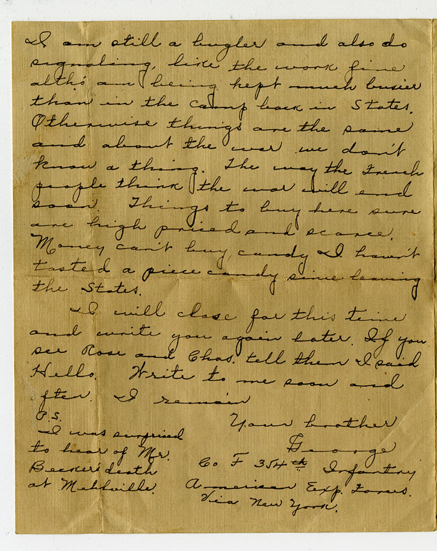 | Description | George Wilde sent this letter to his brother John F. Wilde. Wilde stated that he was staying busy as a bugler and how expensive things were in France. Wilde served as a bugler in the 354th Infantry of the 89th Division. |