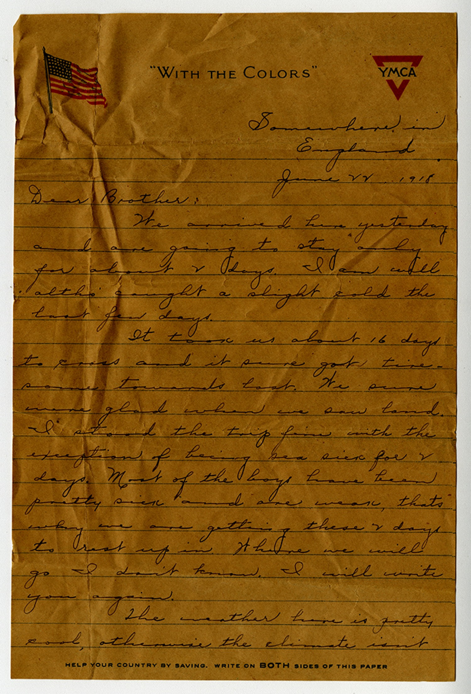 Somewhere in England June 22, 1918 Dear Brother, We arrived here yesterday and are going to stay only for about 2 days. I am well altho caught a slight cold the last few days. It took us about 16 days to cross and it sure got tire some towards last. We sure were glad when we saw land. I stood the trip fine with the exception of being sea sick for 2 days. Most of the boys have been pretty sick and are weak, thats why we are getting these 2 days to rest up in. Where we will go I don