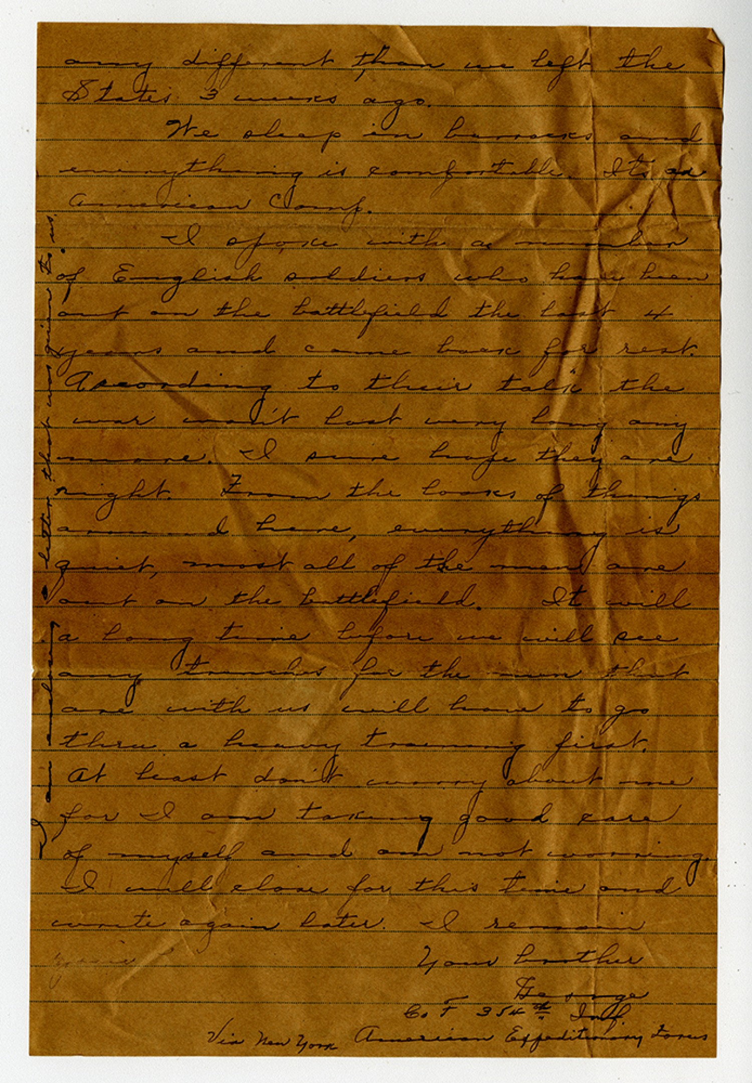 | Description | George Wilde sent this letter to his brother John F. Wilde. Wilde explained how they just arrived in England and described the journey there. George Wilde served as a bugler in the 354th Infantry of the 89th Division. |