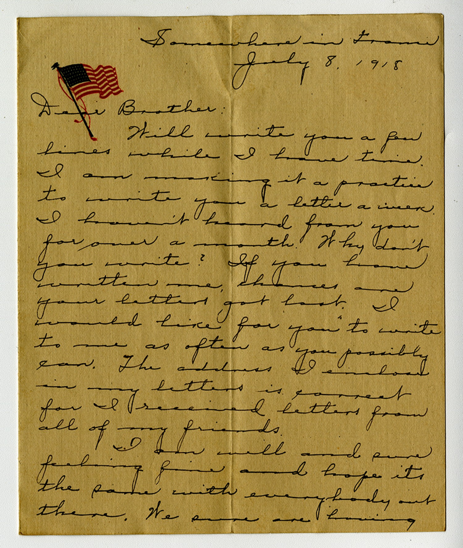 Somewhere in France July 8, 1918 Dear Brother: Will write you a few lines while I have time. I am making it a practice to write you a letter a week. I haven