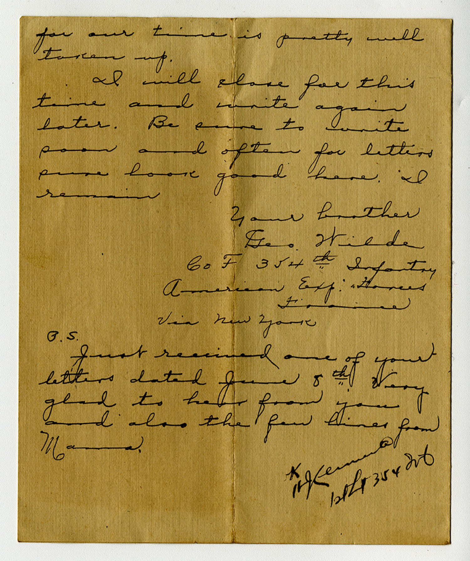 for our time is pretty well taken up. I will close for this time and write again later. Be sure to write soon and often for letters sure look good here. I remain Your brother Geo. Wilde Co F 354th Infantry American Exp. Forces France Via New York P.S. Just received one of your letters dated June 8th. Very glad to hear from you and also the few lines from Mamma. [censor