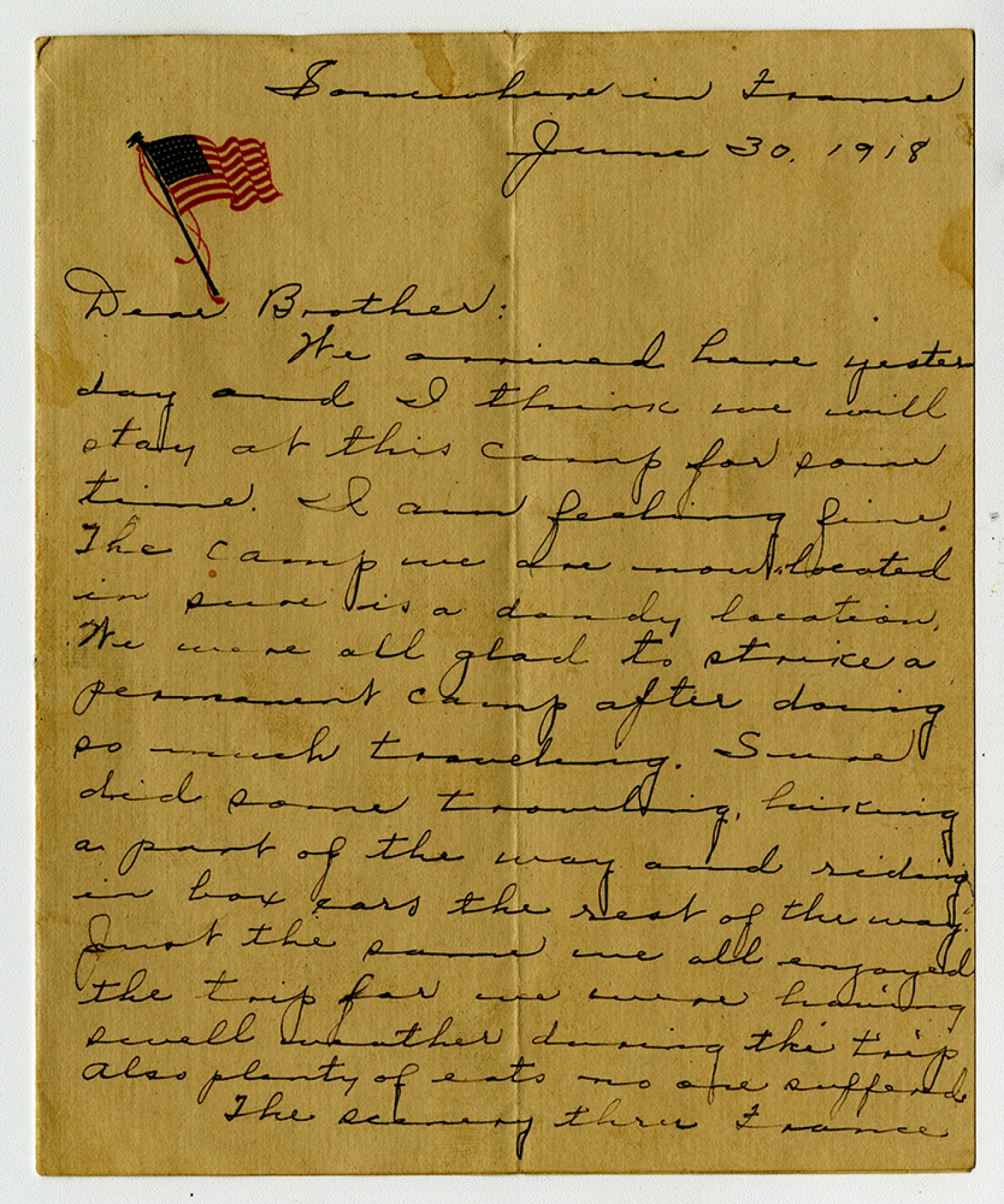 Somewhere in France June 30, 1918 Dear Brother: We arrived here yesterday and I think we will stay at this camp for some time. I am feeling fine. The camp we are now located in sure is a dandy location. We were all glad to strike a permanent camp after doing so much traveling. Sure did some traveling, hiking a part of the way and riding in box cars the rest of the way. Just the same we all enjoyed the trip for we were having swell weather during the trip. Also plenty of eats no one suffered. The scenery thru France
