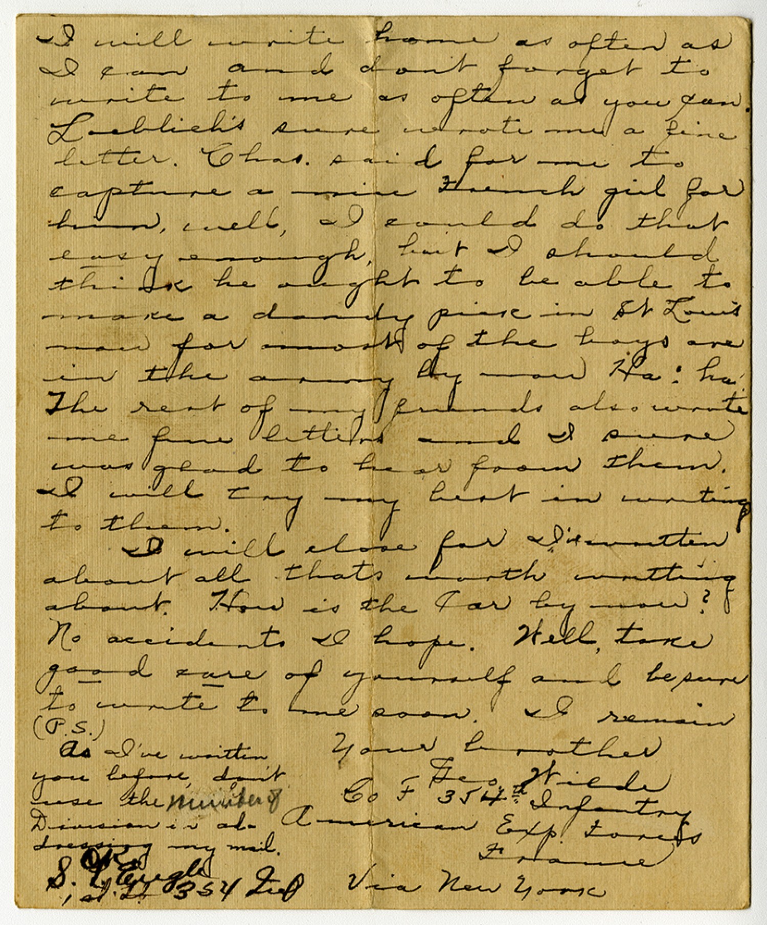 | Description | George Wilde wrote this letter to his brother John Wilde. George told John that he had just arrived in France and described the scenery of France. George Wilde served as a bugler in the 354th Infantry of the 89th Division. |