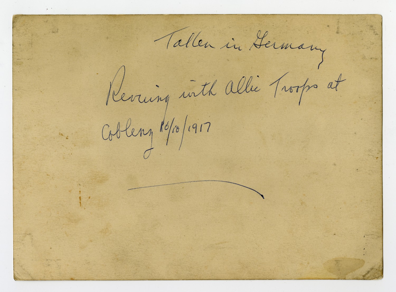 | Description | This photograph of soldiers on review at Coblenz, Germany on October 10, 1917 is part of a collection compiled by Thomas Berenato during his WWI service overseas and preserved by his descendants, the Caldwell family of Marion County, Missouri. |