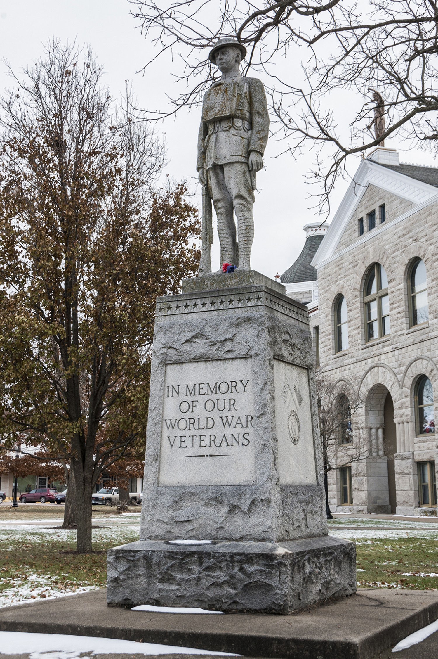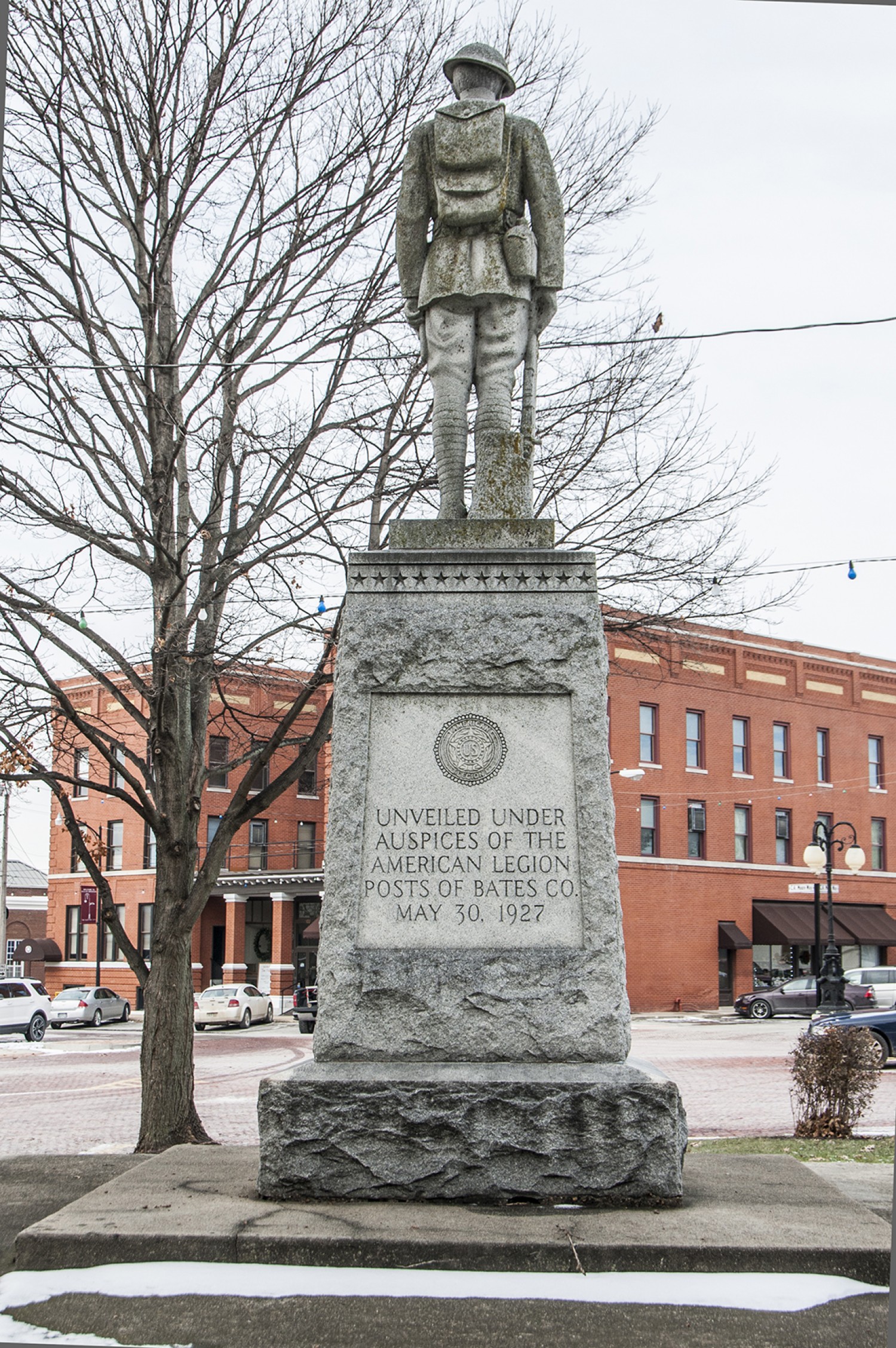 The Bates County Doughboy Statue was erected in 1927 as a memorial to veterans of WWI. It is somewhat unique considering it is made from stone, and does not follow the typical motif of “The Spirit of the American Doughboy” statue originally created by E.M. Viquesney, which was cast in large numbers and can be seen in many towns and counties across the United States. The statue stands at attention, ready to receive orders, where other doughboy statues, including Viquesney’s, depict the soldiers in action poses, or a more relaxed candid pose.