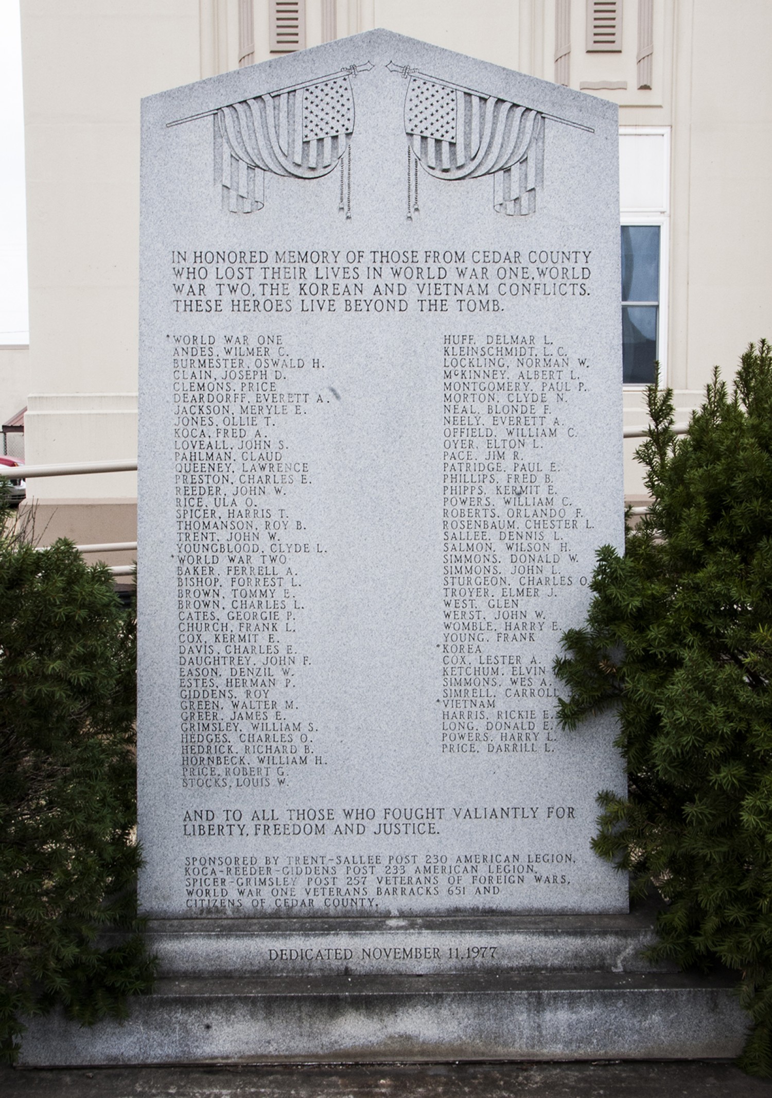 This stone memorial was dedicated on November 11, 1977 to the memory of those from Cedar County who gave their lives while serving in foreign wars. It list the names of those who had died during their service, and they are listed by conflict.