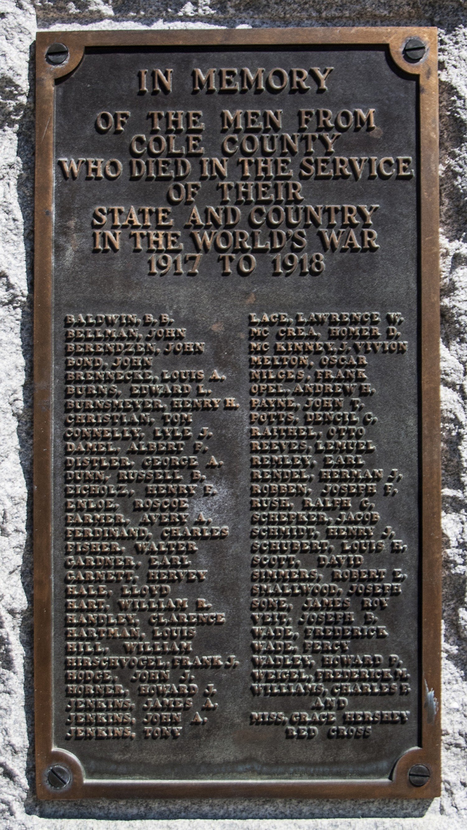 This bronze plaque and stone memorial, topped with a bronze eagle, stands as a memorial to Cole County WWI veterans. It includes a list of those who died during their service, one of which was a Red Cross worker.