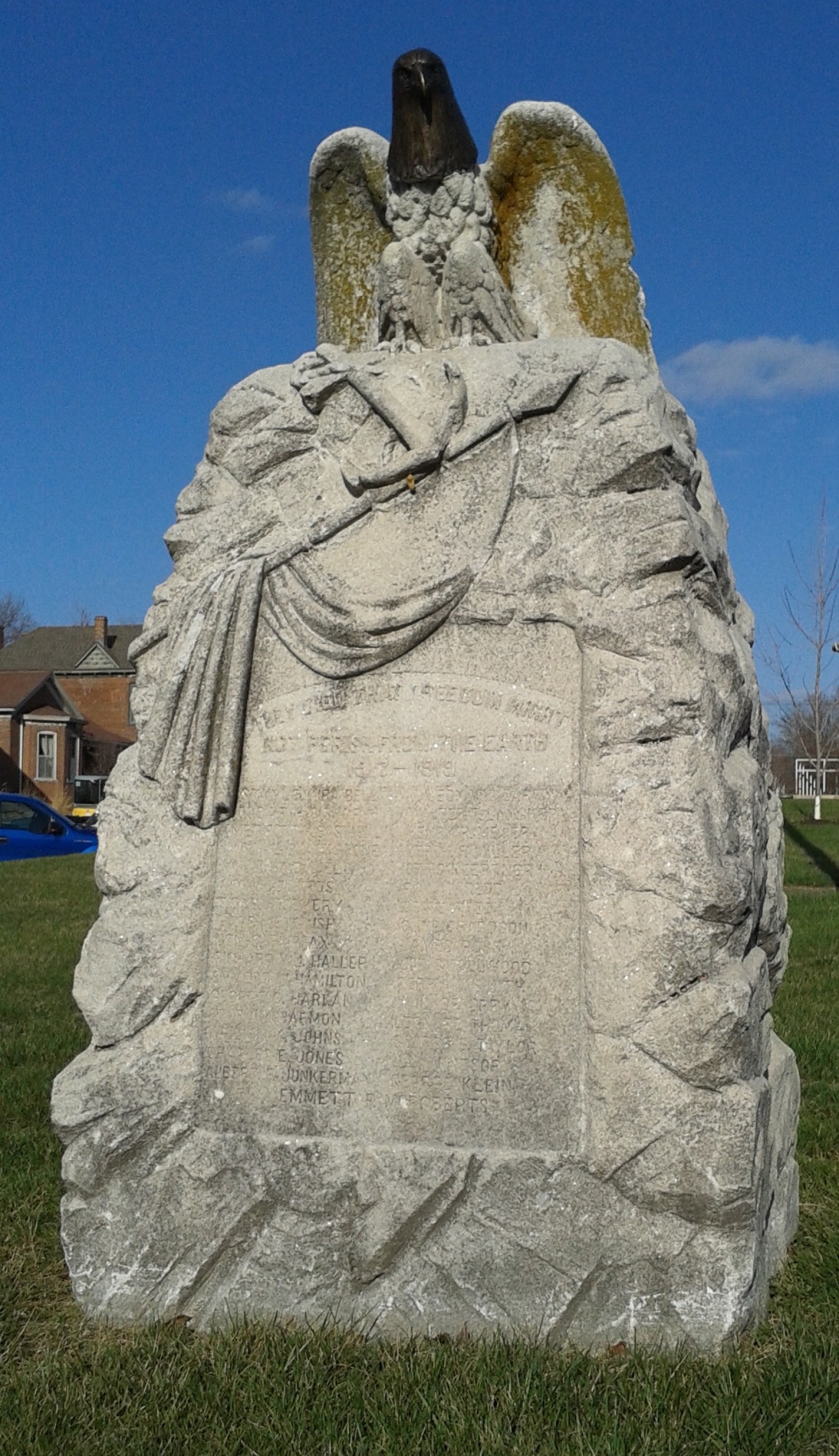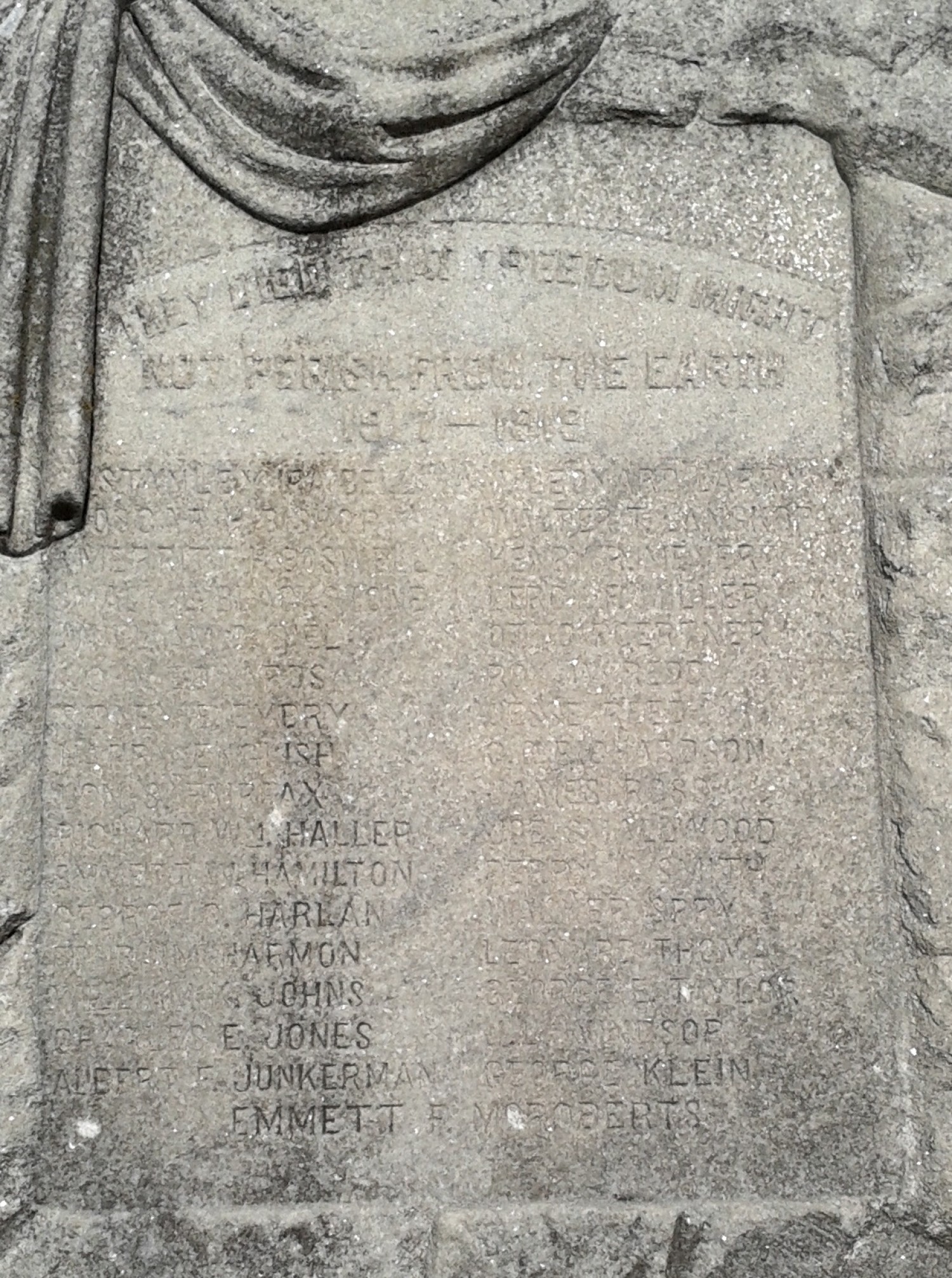 A memorial to the memory of Cooper County's WWI veterans can be viewed at the Cooper County Courthouse in Boonville, Missouri. The large stone monument stands about three feet tall and is inscribed with the names of those who died in the Great War for Democracy. On top of the stone stands a carved eagle. The inscription reads: "They Died that Freedom Might not Perish from the Earth 1917 - 1919". The names are listed as follows: Stanley Ira Bell, Oscar H. Bishop, Merritt H. Boswel, Mack L. Blackstone, William O. Diel, John Edwards, Sidney E. Emery, Harry English, Lon S. Fairfax, Richard Wm. Haller, Emmett W. Hamilton, George C. Harlan, Ephraim Harmon, William K. Johns, Charles E. Jones, Albert F. Junkerman, J. Leonard Larry, Walter T. Langkop, Henry R. Meyer, Leroy F. Miller, Otto Roertner, Roy W. Redd, Jesse Reed, C. C. Richardson, James Ross, Joe Smallwood, Perry L. Smith, Walker Spry, Leonard Thoma, George E. Taylor, J. L. Windsor, George Klein, Emmett F. McRoberts