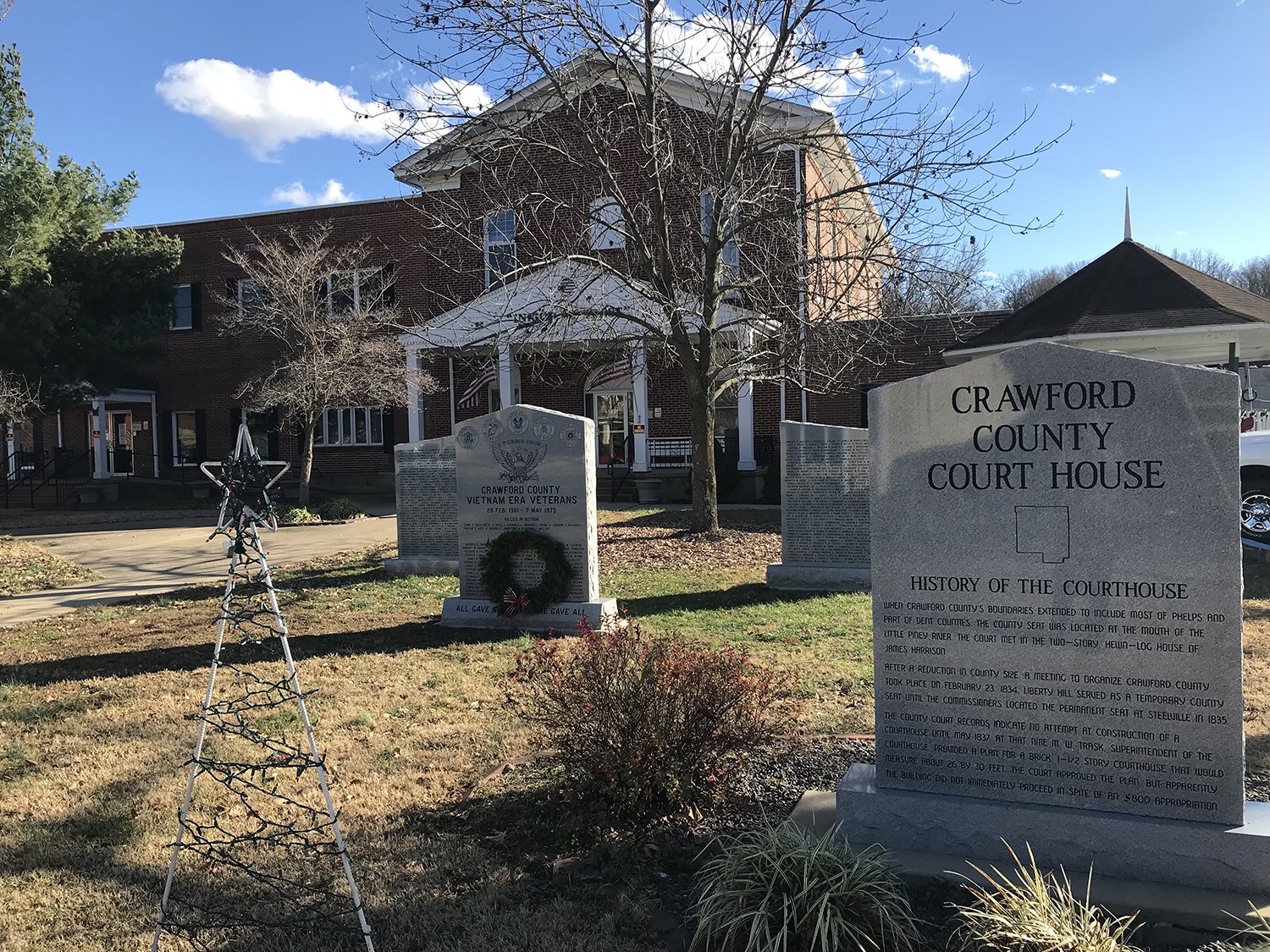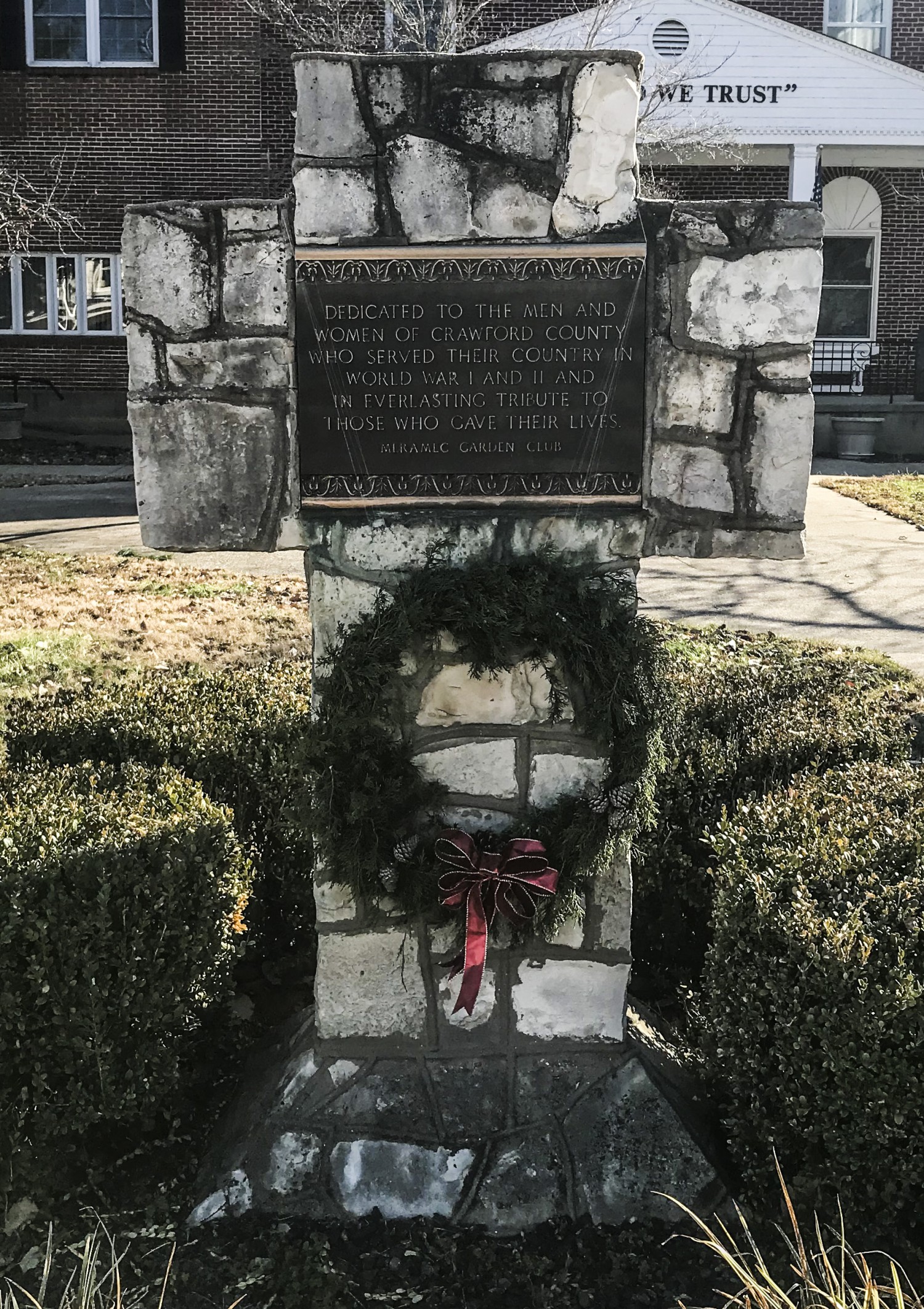 This stone cross in Steelville, Missouri, located at the Crawford County courthouse is dedicated to the men and women of Crawford County who served during the World Wars.