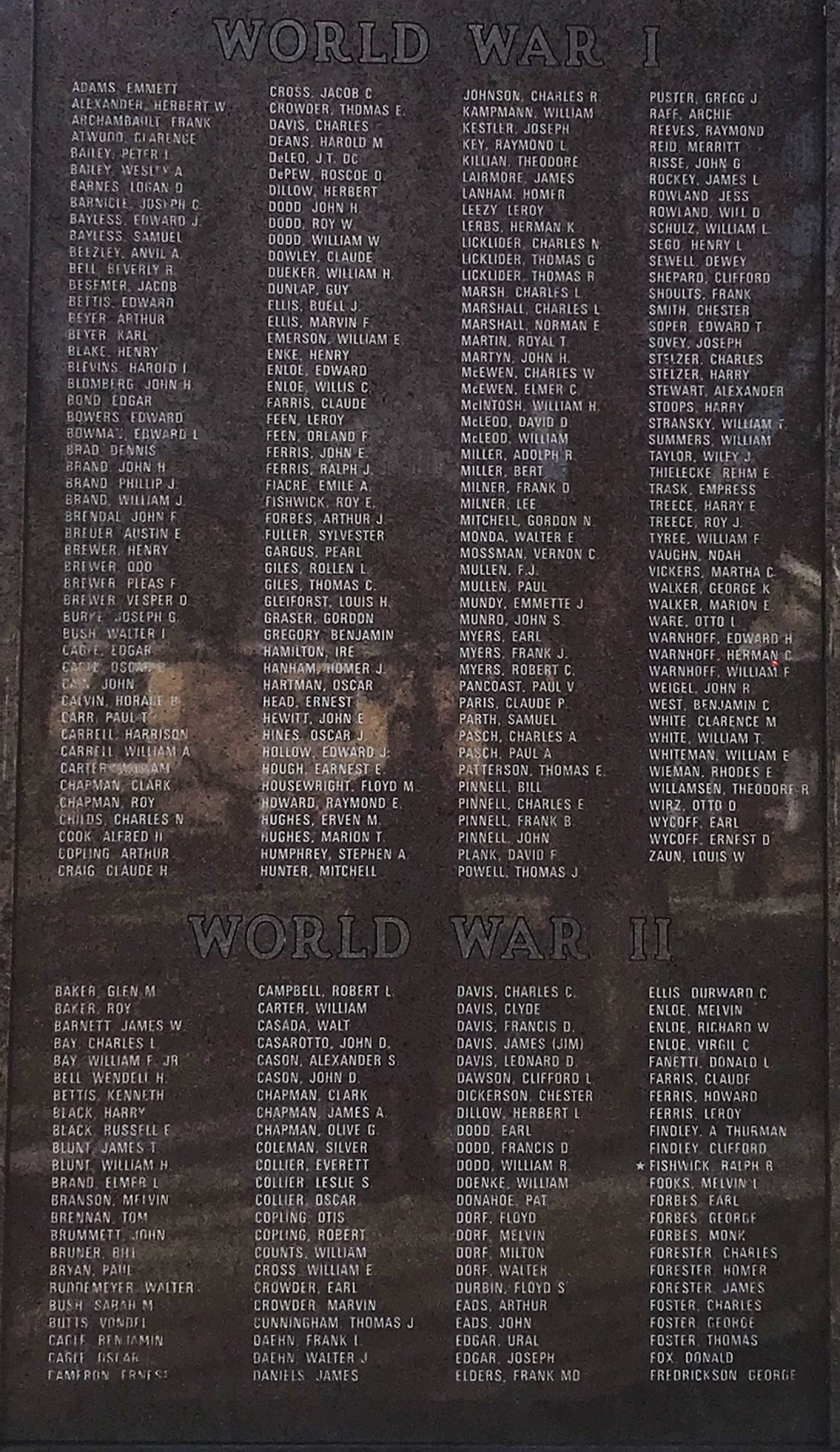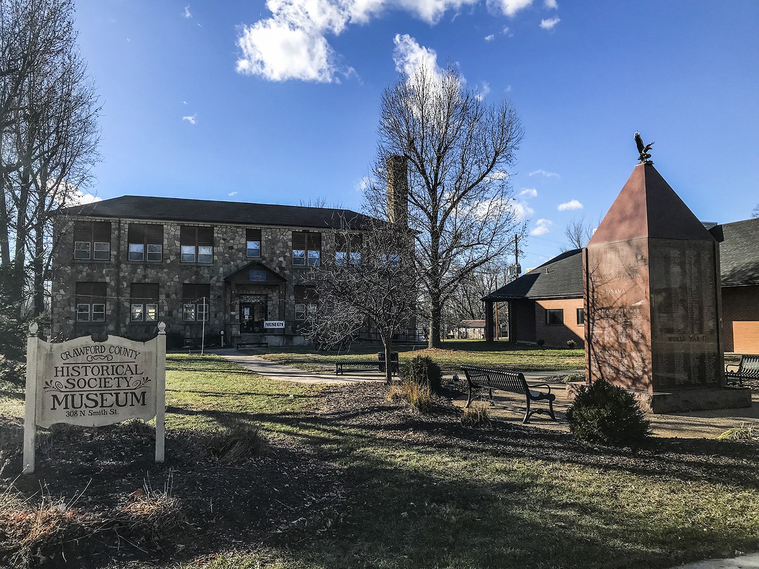 A memorial to the veterans of foreign wars in Crawford County stands on the grounds of the Crawford County Historical Society and lists the names of veterans who served.