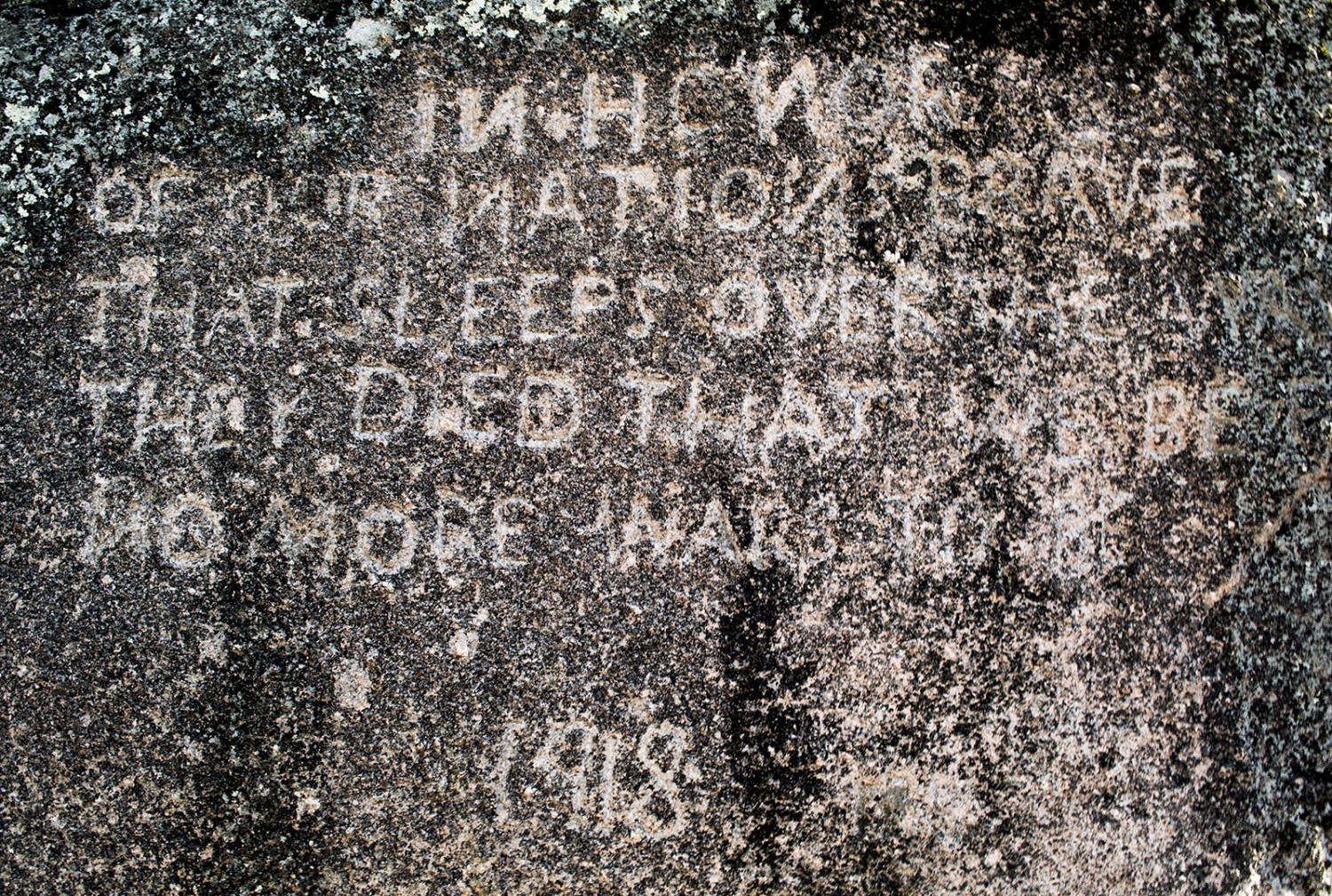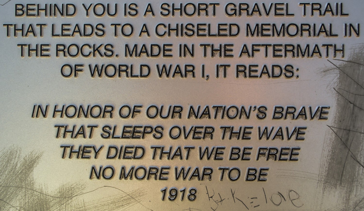 This memorial to fallen soldiers was carved into the pink granite stones of Elephant Rocks State Park in 1918 shortly after the signing of the armistice on November 11 of that year. The inscription has faded over time and is now accompanied by a metal transcription plate that has been marred over time by park visitors. The monument stands along the Braille Trail at the state park on the southeastern portion of the trail and is not easily visible.
