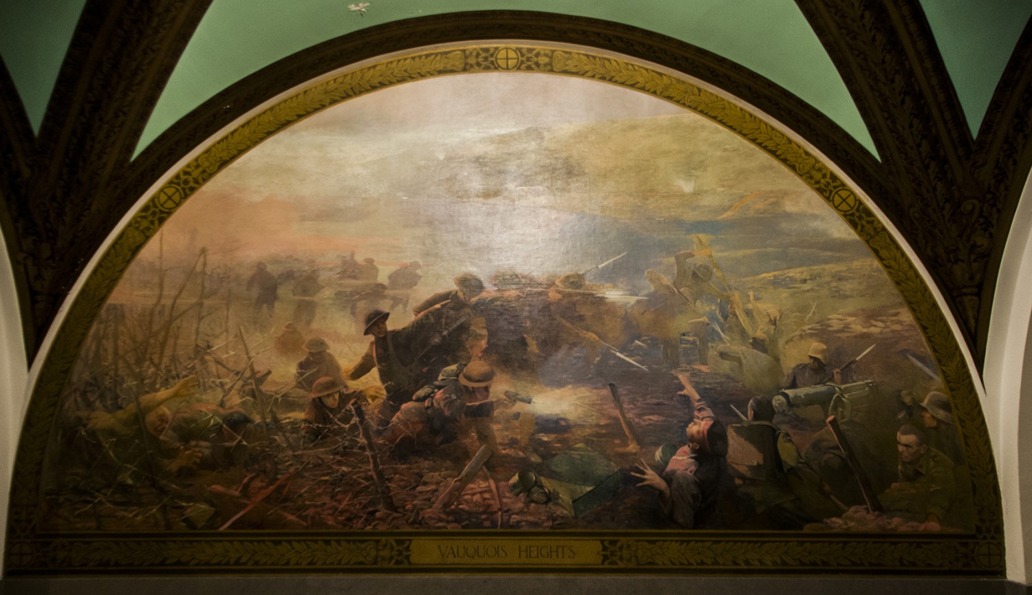 Another painting, to the left of the previously mention work, is Adolphe Blondheim’s “Vauquois Heights”, which focuses on the land exploits of the American Expeditionary Force in France during the Meuse Argonne Offensive of 1918. The painting was completed prior to 1922 and depicts soldiers of the 35th division taking a hill from German opposition. The subject for this painting was again chosen by General Pershing, who decreed Vauquois Heights was one of the most significant battles that Missouri Soldiers participated in. The painting was met with mixed reviews, some considered it flat and could have been anywhere in France. Others viewed the painting as an accurate depiction of the 35th division’s efforts during the battle of the Meuse, one in which Harry S. Truman was present and wrote about in his letters to his future wife Bess Wallace.