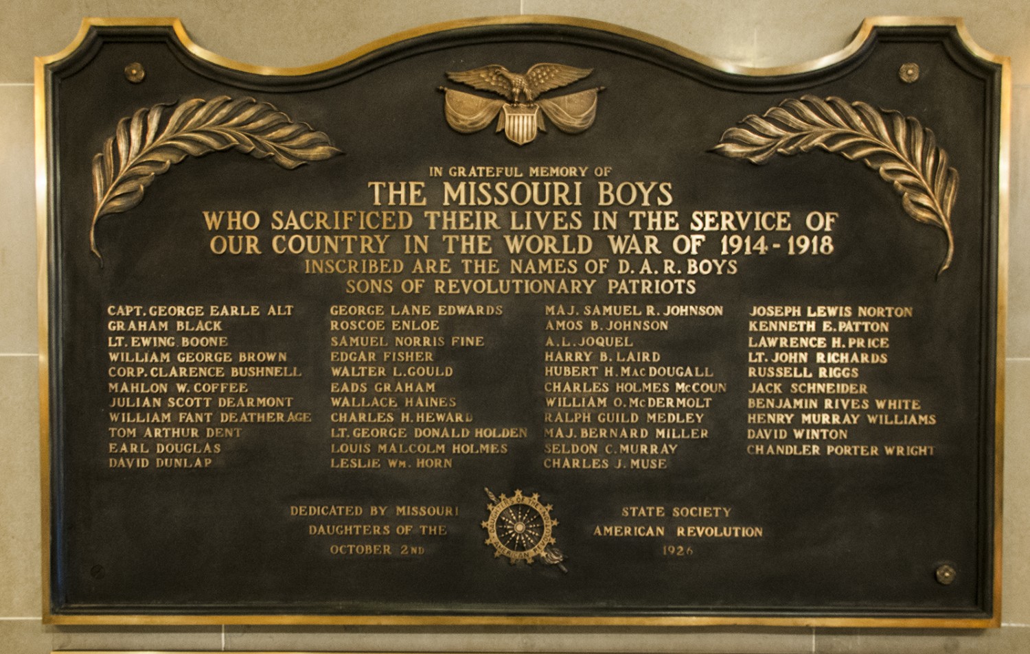 Within the History Hall stands a bronze memorial plaque that stands “in grateful memory” of Missouri’s WWI Veterans, listed are soldiers who were affiliated with the Daughters of the American Revolution and Sons of Revolutionary Patriots groups. The plaque was dedicated on October 2, 1926 by the Missouri State Society of the Daughters of the American Revolution.